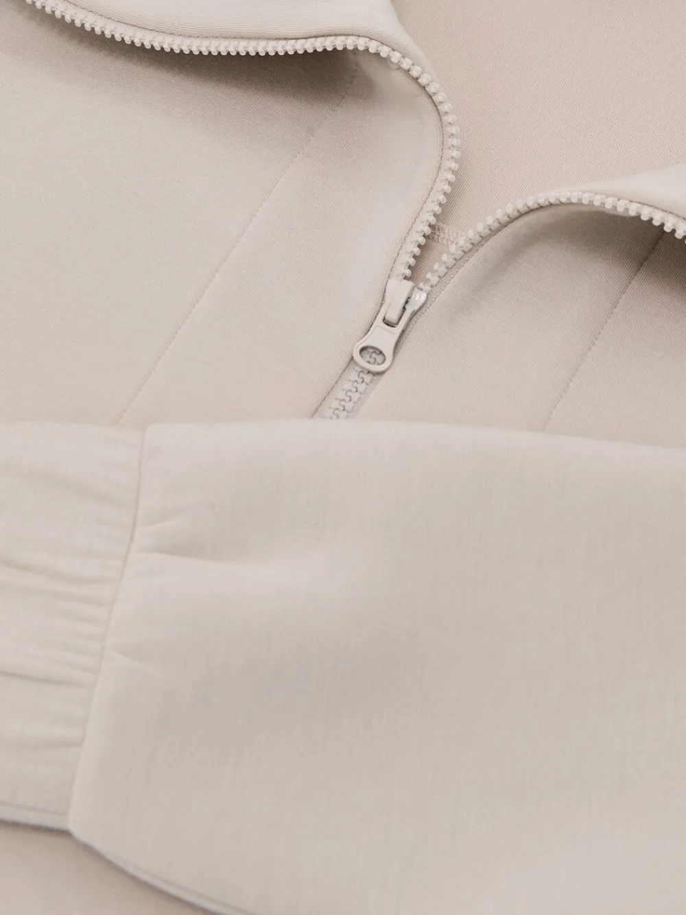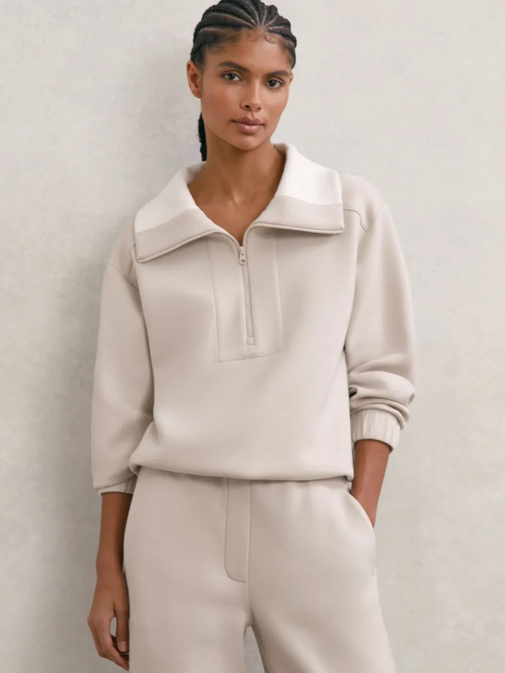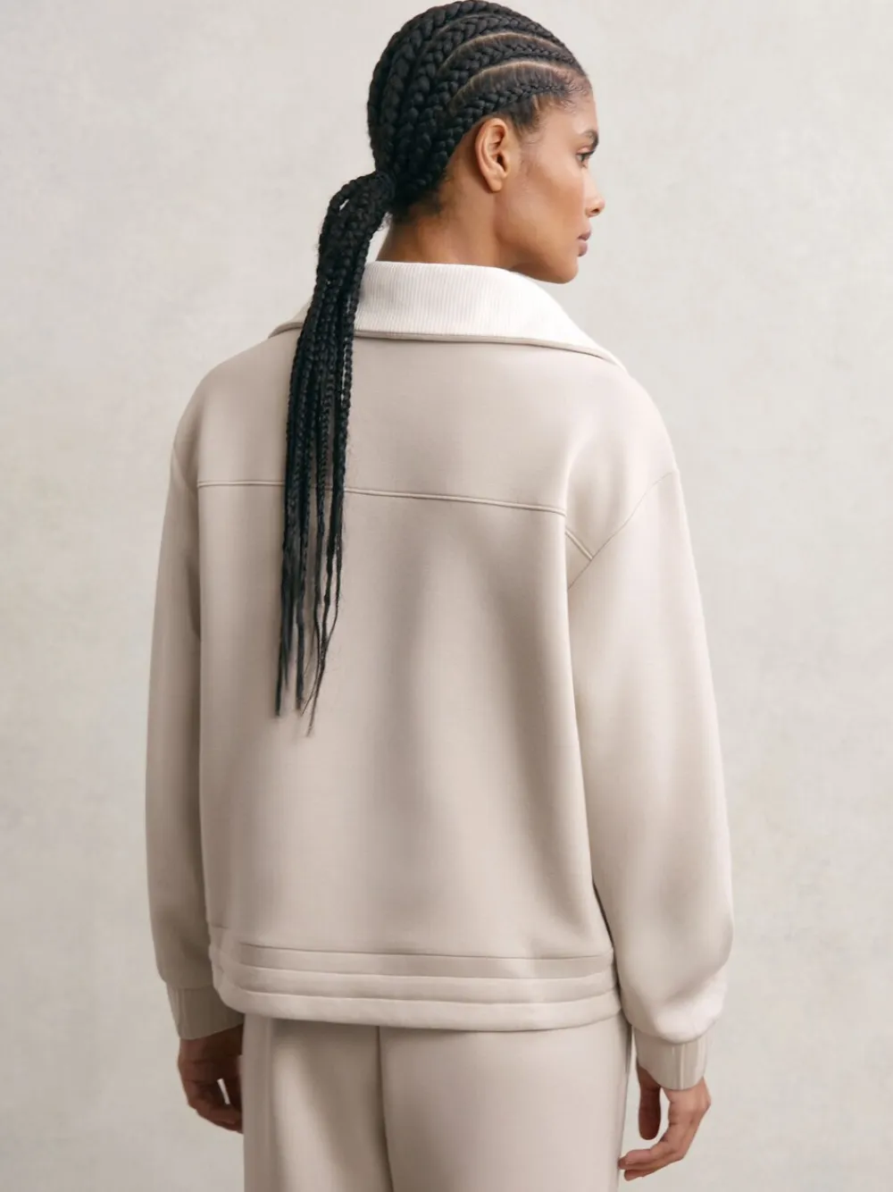 The stone neutral Laney sweatshirt is crafted from premium interlock jersey for soft structure and fluid drape. It has a relaxed funnel neck with a half-zip and a drawstring hem. Premium interlock jersey with stretch Relaxed fit Funnel neck with contrast ribbing Elasticated cuffs Drawstring hem Half zip Machine washable. Main 60% Polyester, 35% Viscose, 5% Elastane. Trim 50% Nylon, 25% Acrylic, 20% Polyester, 3% Wool, 2% Elastane.