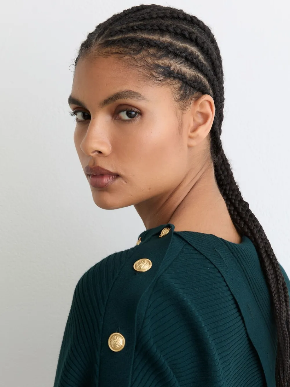 The Lexi jumper is crafted in a compact rib knit with a relaxed drape and drop shoulders. An asymmetric shawl neckline is accented by crest-embossed buttons that trace one shoulder, lending an elevated finish. Rib knit Shawl neckline Crest-embossed buttons Drop shoulders. Hand wash only. 59% Viscose, 24% Polyester, 16% Nylon, 1% Elastane.