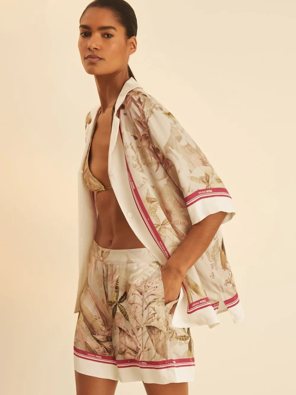 The Santana shorts showcase a reimagined tropical floral print, inspired by illustrations from the New York Botanical Garden’s rare book collection. Crafted from fluid satin, they’re neatly framed by a contrasting branded stripe. Satin Botanical floral print Brand stripe at hems Elasticated waistband Side seam pockets The Reiss x NYBG collection blends nature’s beauty with modern design, inspired by the New York Botanical Garden’s rare book collection. Featuring a mix of new and signature styles, it reimagines archival illustrations through a contemporary lens, with floral prints and bold colours that capture both botanical artistry and the city’s vibrant energy. This collection supports NYBG’s work in global plant research and conservation, horticulture, and education. The model is wearing a size 8. Measurements of model: Height 5ft 10” / 177.8cm. Regular inside leg length 4.5″ / 11cm. Dry clean only. 100% Viscose.