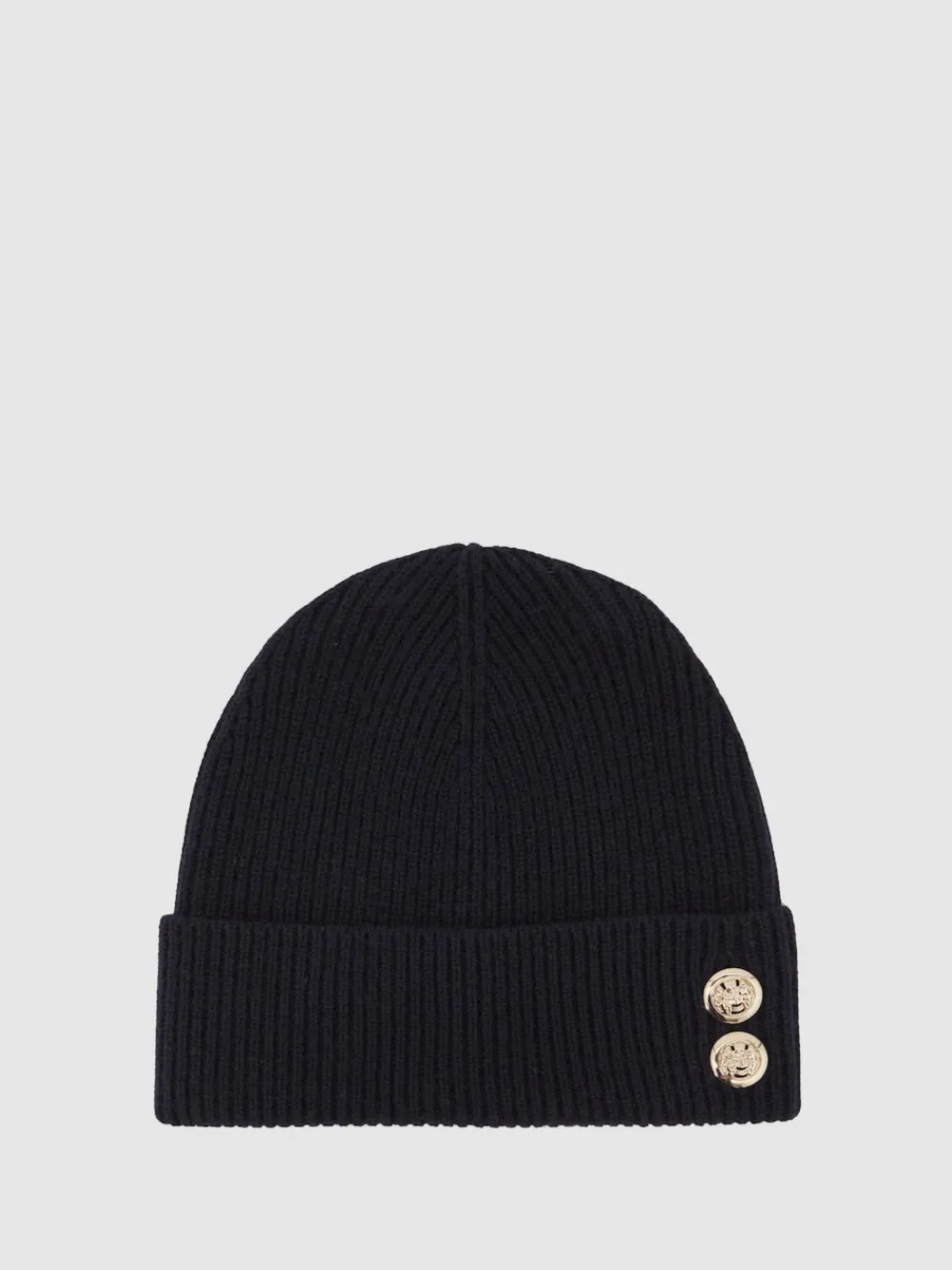 The Bianca beanie is rib-knitted from a merino wool blend with a touch of cashmere for superior softness. Two crest-embossed buttons add a polished finish to the turn-up design. Merino wool blend with cashmere Rib knit Crest-embossed buttons Turn-up design Wipe clean only. 47% Merino wool, 38% Viscose, 10% Cotton, 5% Cashmere.