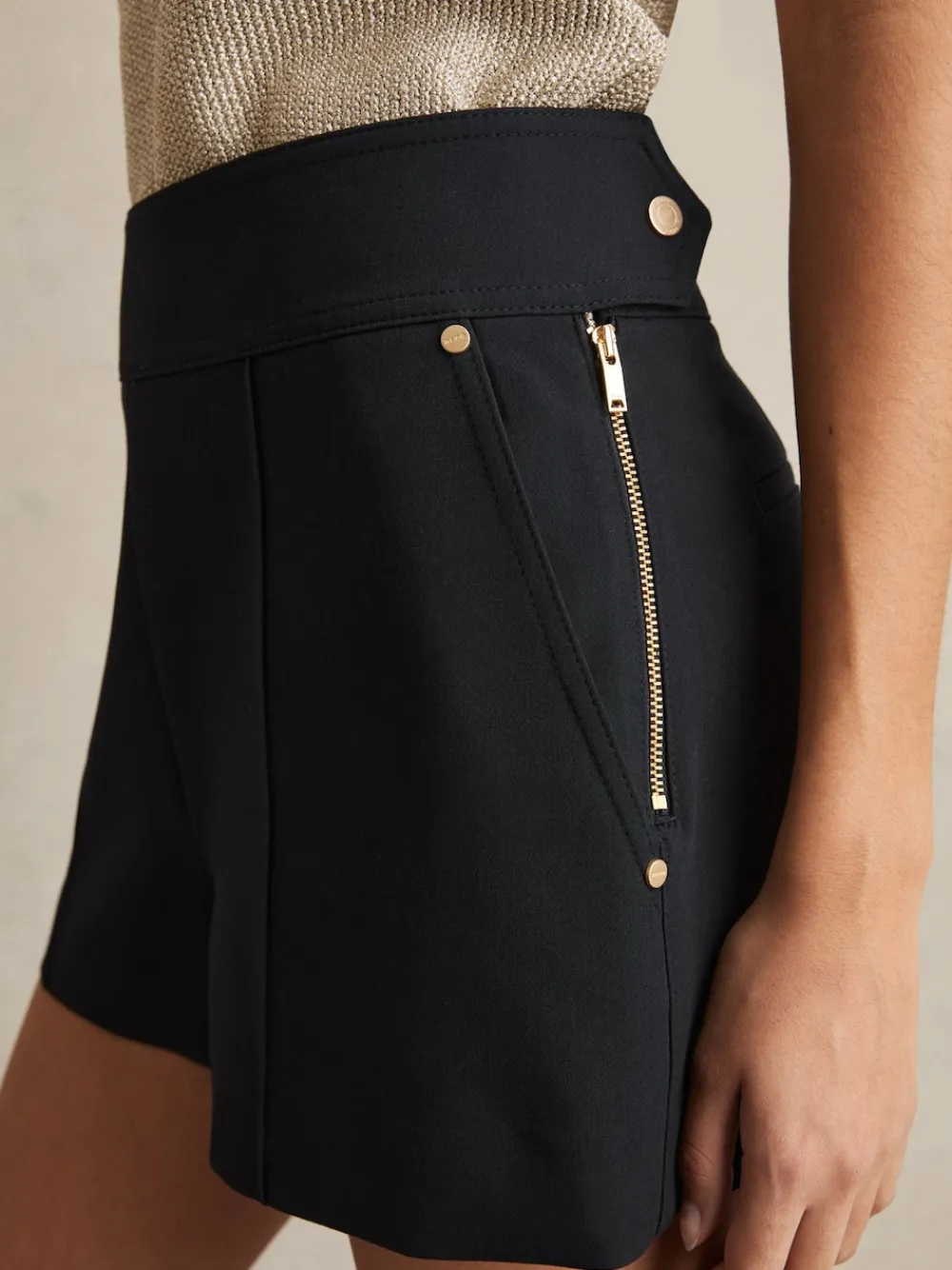 The Immie shorts blend sharp tailoring with refined detailing. Gold-tone logo-engraved studs accent the angled side pockets, while central pintucks add elegant structure to the front. Logo-engraved studs Front pintucks Angled side pockets Welt pockets to reverse Side zip with press-stud tab The model is wearing a size 8. Measurements of model: 5ft 9.5” / 176.5cm. Regular inside leg length 3″ / 7cm. Machine washable. 69% Polyester, 25% Viscose, 6% Elastane.