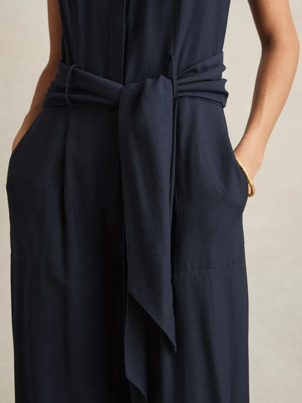 The Raven jumpsuit offers a sleek, modern silhouette with its wide-leg cut and self-tie belt, creating a flattering, relaxed fit. A contemporary band collar and side pockets add both style and functionality, making it an effortless choice for any occasion. Woven finish Wide leg Self-tie belt Band collar Side slip pockets Concealed front button placket The model is wearing a size 8.Measurements of model: 5ft9.5 / 176.5cm Regular inside leg length 30″ / 76cm. Machine washable. 90% Viscose, 10% Nylon.