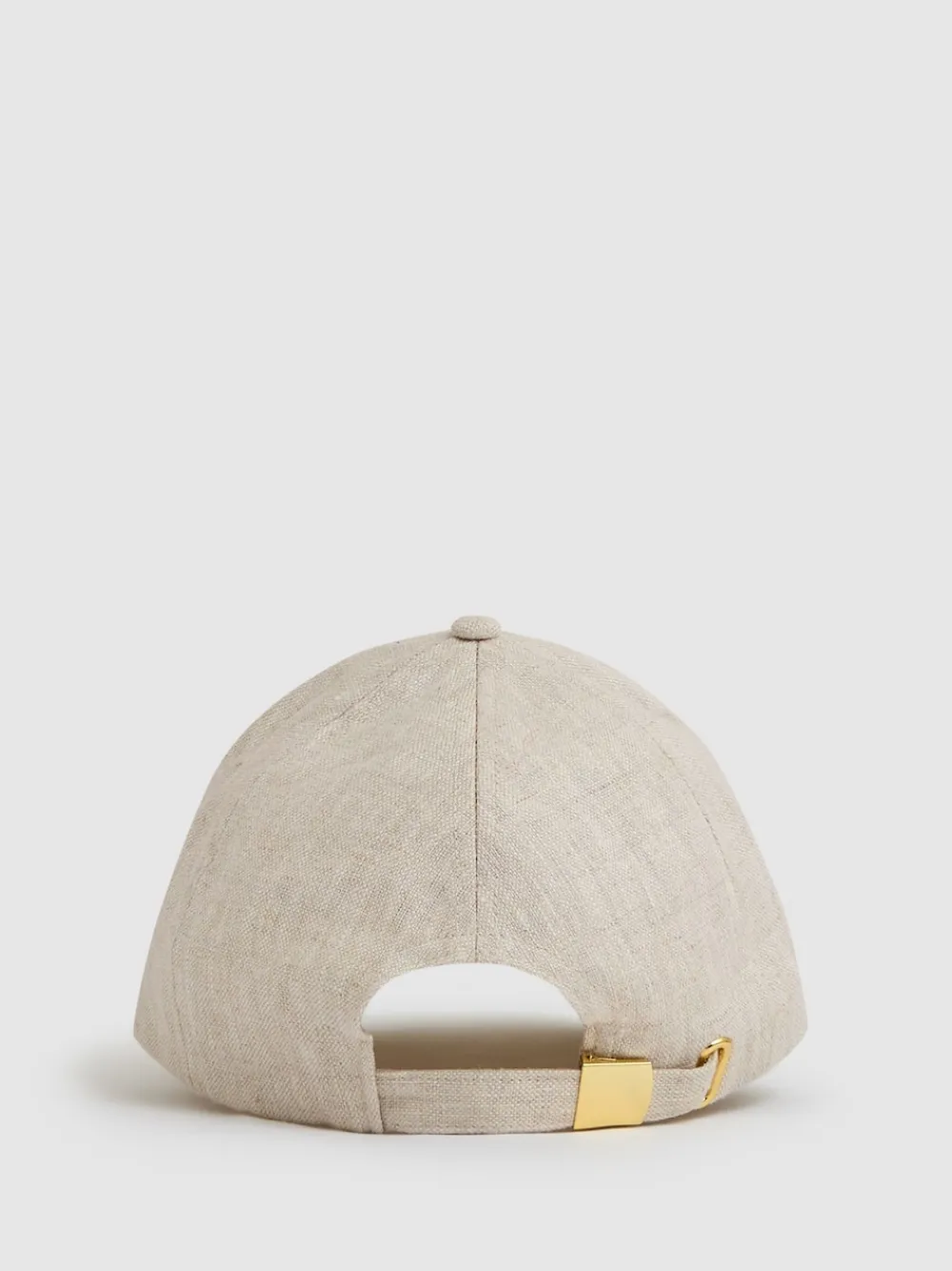The Lilly cap reimagines the classic baseball silhouette with a natural linen construction, offering a fresh take for warm-weather styling. A subtle gold-tone ‘R’ logo adorns the front. 100% linen Gold-tone ‘R’ logo Curved peak Adjustable strap to reverse Wipe clean only. 100% Linen.
