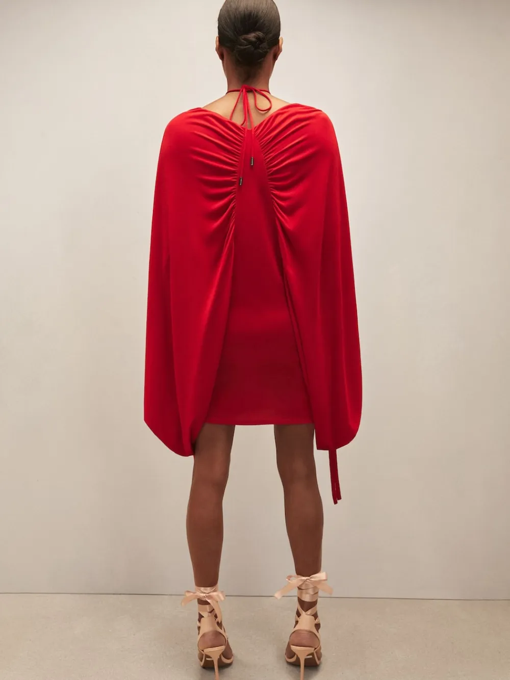 The Jete dress, in striking scarlet inspired by the Royal Opera House, pairs a fitted body with oversized batwing sleeves that drape with dramatic volume. Crafted from soft, fluid jersey with a subtle lustre, the mini silhouette is elevated by gathered detailing, a self-tie halterneck, and drawstring ribbons at the cuffs. Soft jersey Batwing sleeves Self-tie halterneck straps Drawstring ribbons at cuffs Gathered detailing The Reiss x Royal Ballet collection draws inspiration from the artistry, grace, and costumes of The Royal Ballet, with 10% of sales being donated to the Royal Opera House and Covent Garden Foundation (Charity Number: 211775). The model is wearing a size 8. Measurements of model: Height 5ft10” / 177.8 cm Regular side neck to hem 30.5″ / 78cm. Dry clean only. 100% Viscose.