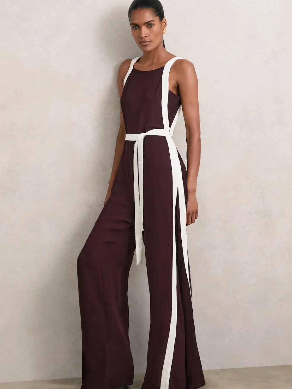 Reiss Salma Colourblock Wide Leg Belted Jumpsuit Burgundy/Cream Sale