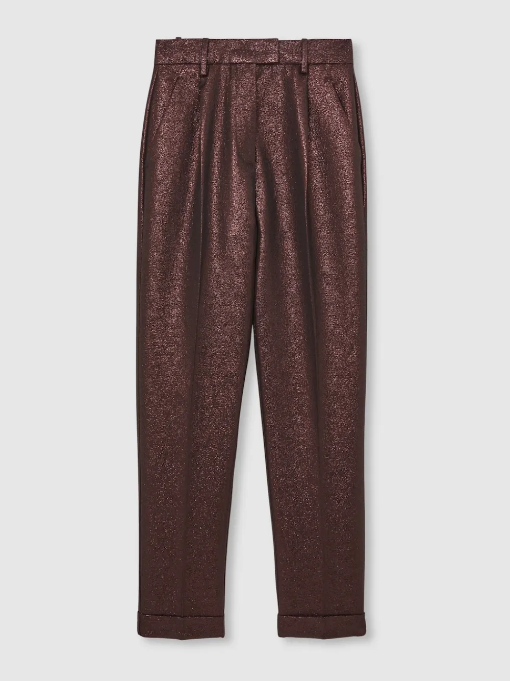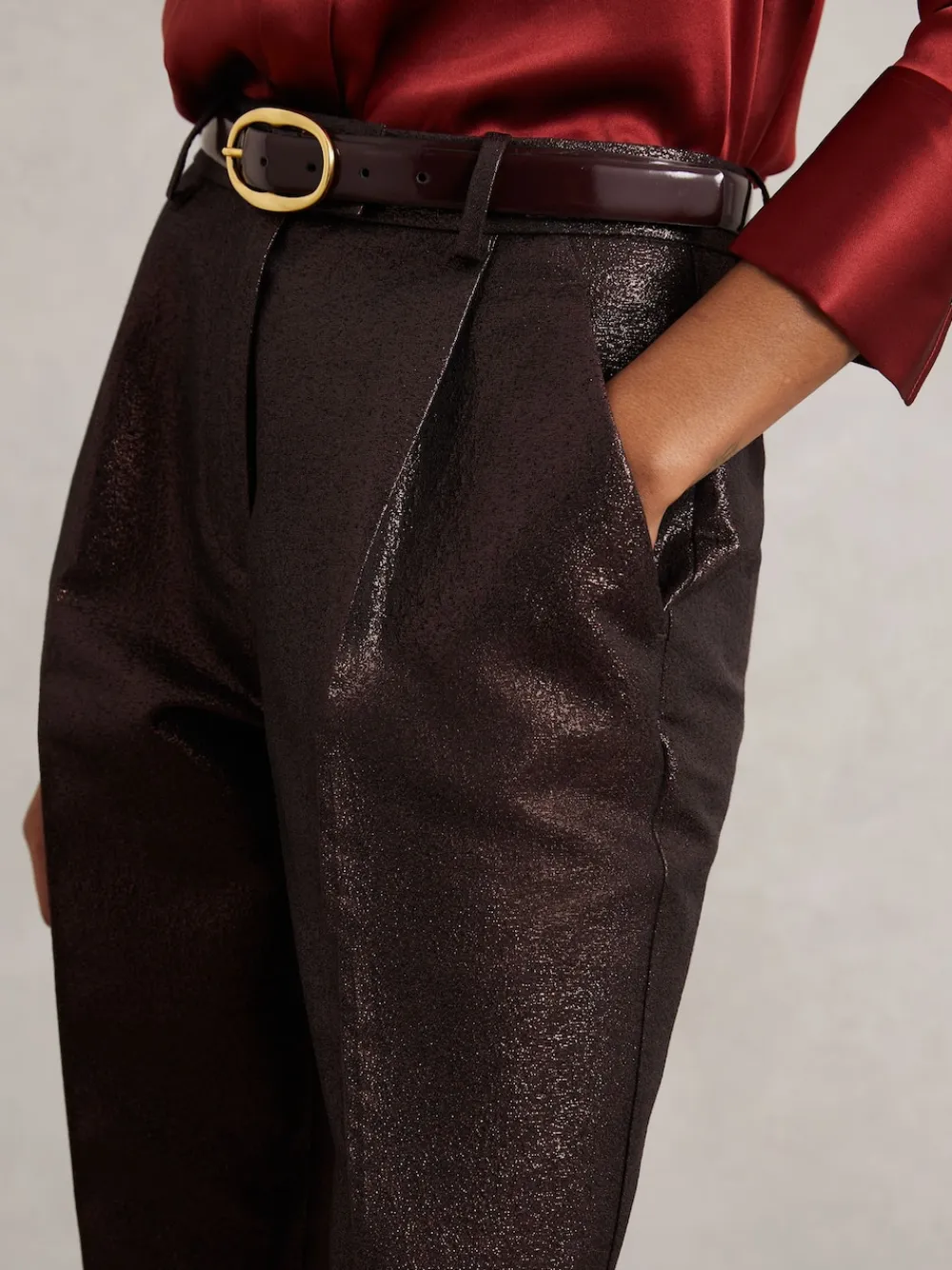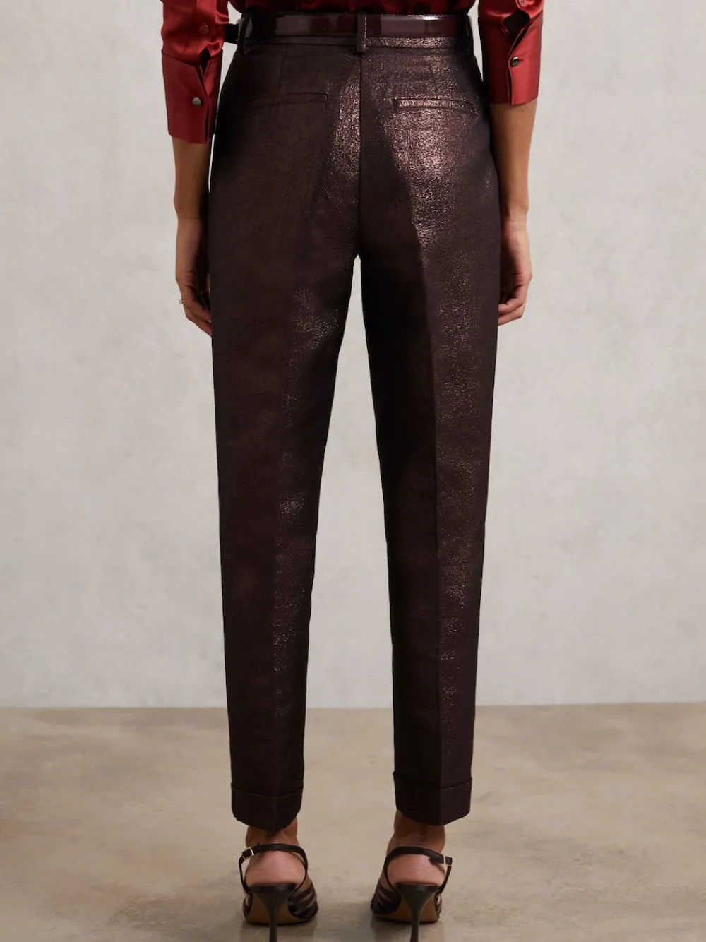 The Sienna Burgundy trousers are crafted from a cotton-blend with metallicised thread, delivering a striking, lustrous finish. Front pleats define the tailored shape, while turn-up cuffs neatly finish the tapered silhouette. Cotton-blend Metallicised thread Tapered leg Turn-up cuffs Hook-and-bar with zip The model is wearing a size 8. Measurements of model: Height 5ft 10” / 175cm. Regular inside leg length 27″ / 68cm. Machine washable. 54% Cotton, 35% Polyester, 11% Metallised fibre.