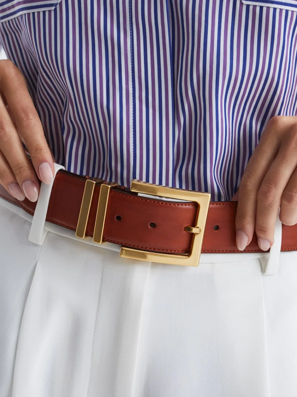 The tan Brompton belt is an effortlessly wearable style for complimenting outfits. It’s crafted from supple leather bordered by tonal topstitching. Wear it to anchor high-rise jeans and a tucked-in shirt. Leather fabrication Tonal top-stitching Gold-tone metal buckle Width 3.5cm 100% Leather.