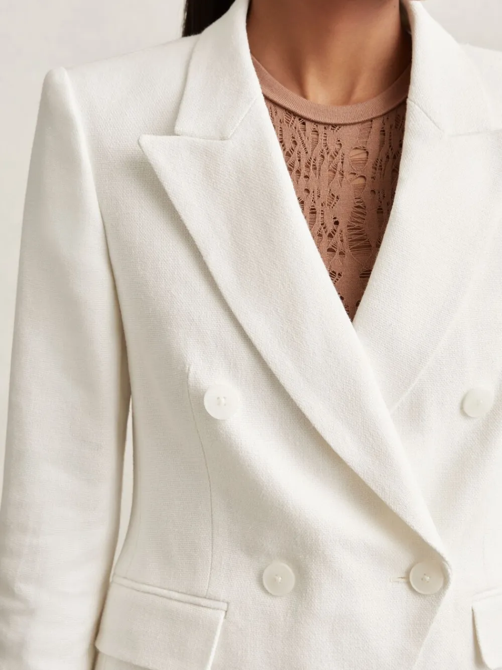 The White Devon suit jacket is crafted from a lightweight linen blend, perfect for sophisticated warm-weather looks. With its double-breasted design, peak lapels, and lightly padded shoulders, it offers a sharp, structured silhouette. Linen blend Double-breasted Peak lapels Lightly padded shoulders Single vent at reverse The model is wearing a size 8. Measurements of the model: 5ft 9” / 176.5cm. Dry clean only. 55% Viscose, 45% Linen.