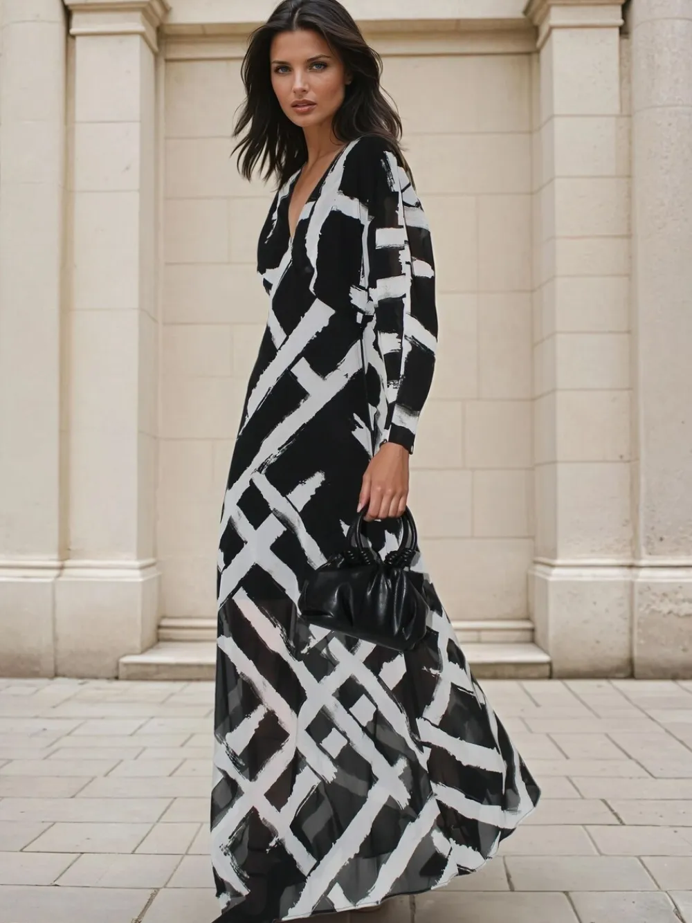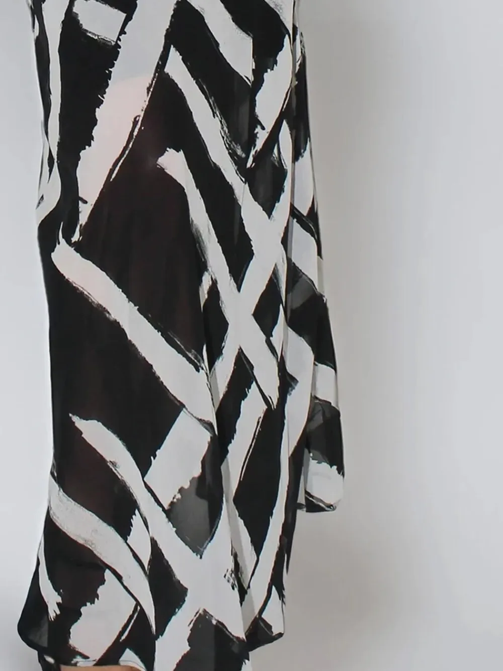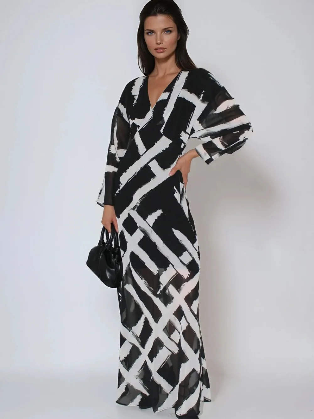 The Lily Maxi Column Dress features a flattering deep V-Neck, elegant sheer batwing sleeves, and a flowing bias-cut skirt part. Offered in our hand-painted abstract Monochrome Selvage print, it’s an effortless choice for any occasion—sophisticated, easy, and striking. The model wears a size UK 10. Length from the top: 140 cm. Regular side neck to hem 55″ / 140cm. Machine washable. Shell 100% Polyester. Lining 100% Viscose.