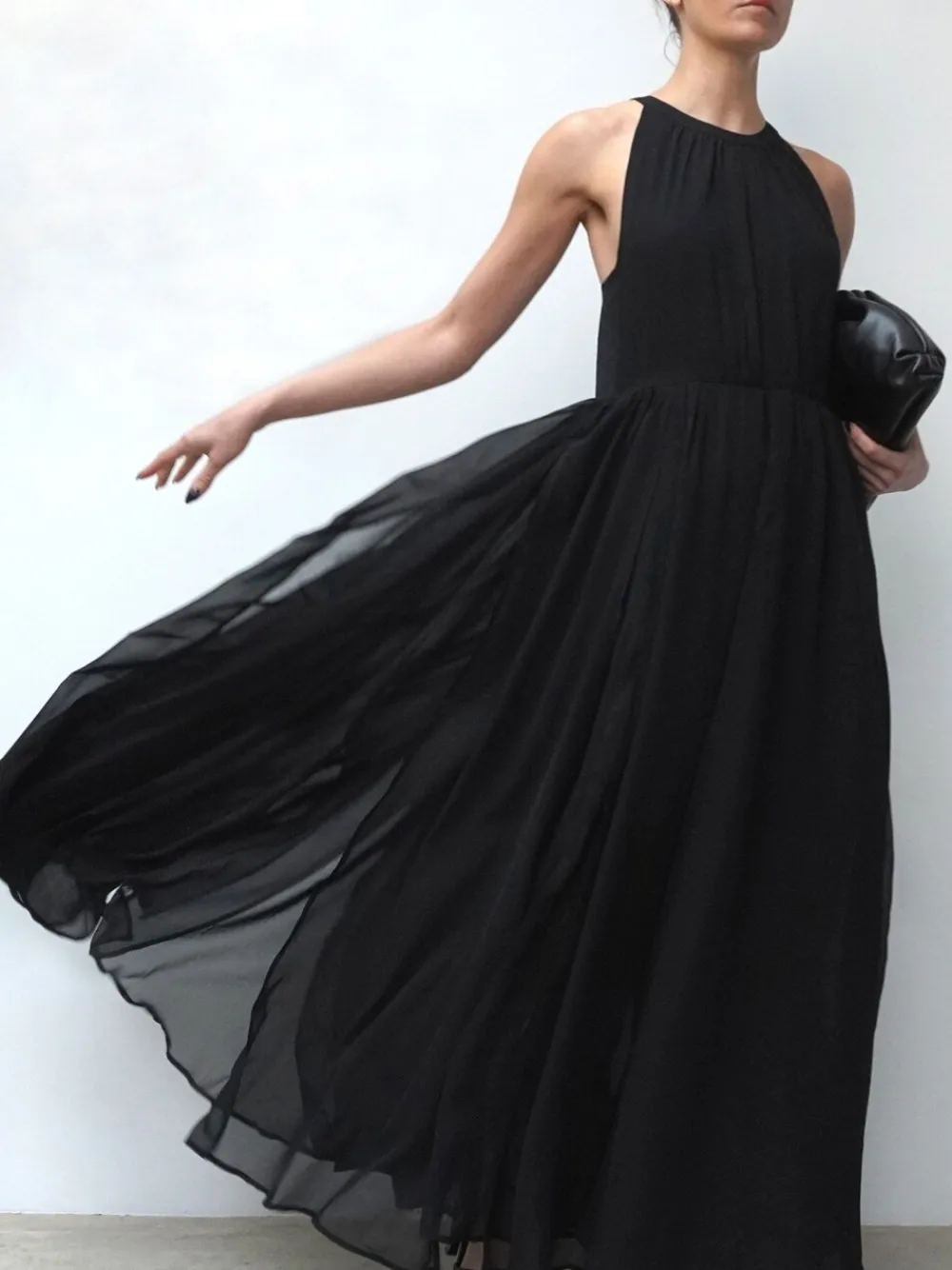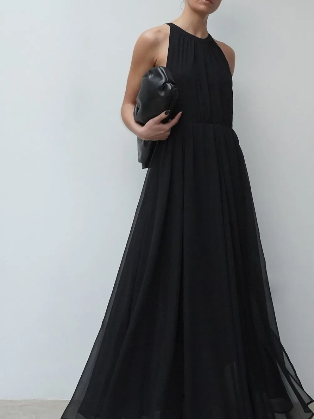 The halter neck black Dusk Maxi Dress is the sister to an iconic best-selling shape for The Brand. The maxi dress is made from layers and layers of semi-sheer chiffon fabric with a halter neck top part with a zip back opening and button key-hole detail, it comes with a body lined under a mini skirt. The maxi skirt with gathered pleats and high splits is made from 10m of floaty georgette fabric that comes from an empire line with a lot of volumes. It can be taken up by a tailor if it is too long as only 1 length is offered. The model wears a size 10 and fits true to size as the bust must remain more fitted while the skirt part is loose, dramatic and floaty. Hand wash only. Main 100% Polyester. Lining 100% Viscose.