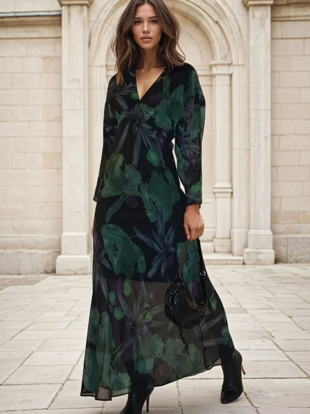 The Lily Maxi Column Dress features a flattering deep V-Neck, elegant sheer batwing sleeves, and a flowing bias-cut skirt part. Offered in our hand-painted dark green Prime floral print in rich tones, it’s an effortless choice for any occasion—sophisticated, easy, and striking. The model wears a size UK 10. Length from the top: 140 cm. Regular side neck to hem 55″ / 140cm. Machine washable. Shell 100% Polyester. Lining 100% Viscose.
