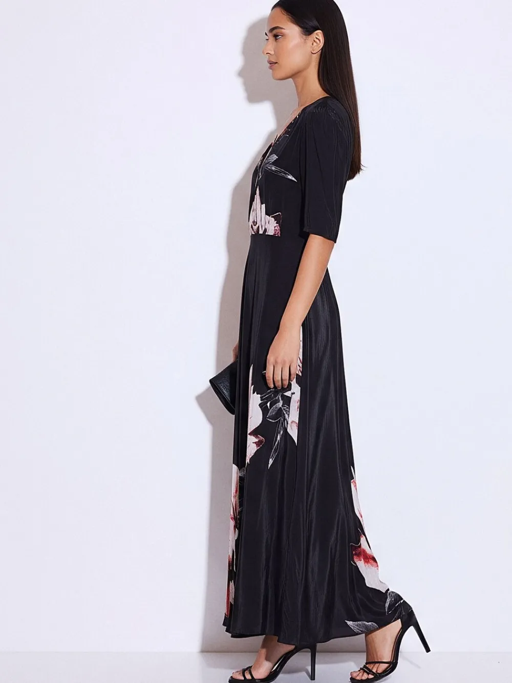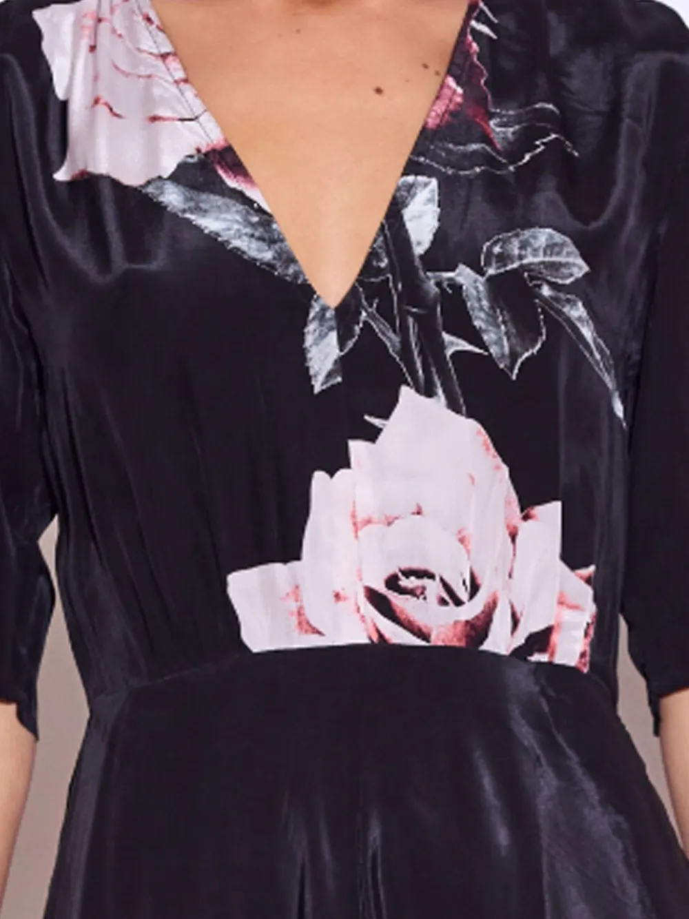 Due to the nature of the print, each garment will be unique. The Diana Tea Dress is a flattering bias-cut maxi dress made from a silk-like luxurious fabric with a soft drape. It features a deep V-Neckline, short puff sleeves, and our large floral Rose Heart placement print in pink & red tones on jet black. Effortlessly feminine and elegant—perfect for any special occasion. Regular side neck to hem 56.5″ / 143cm. Dry clean only. Shell 100% Viscose. Lining 100% Viscose.
