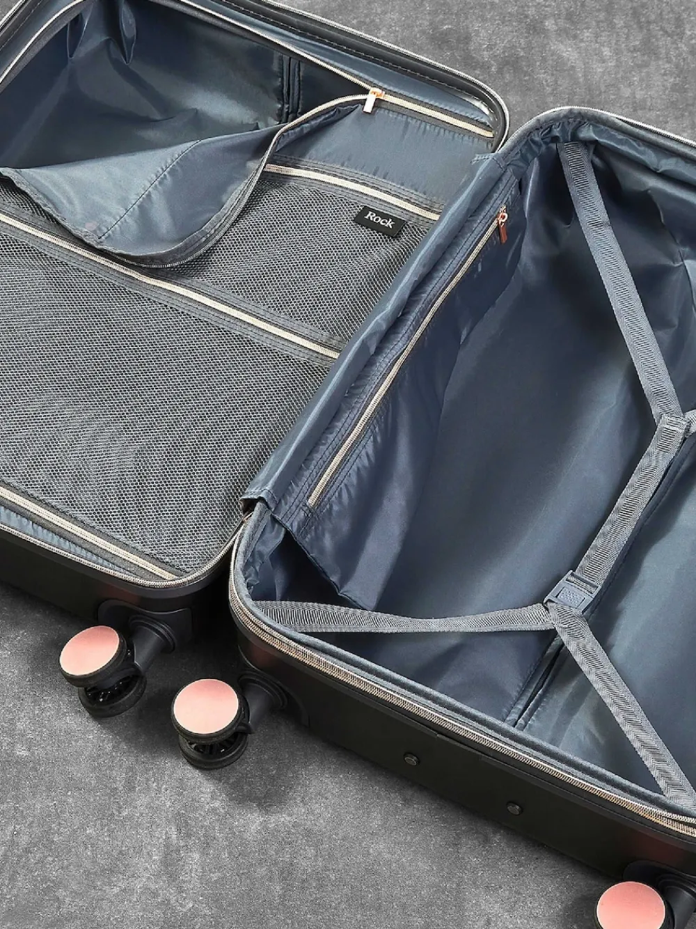 Beautifully finished with rose gold accents, the Aria luggage range is for those who demand more from their travel accessories. Expandable – leave your packing worries behind with Aria’s expander zip which can be opened to increase the volume of the case, providing valuable additional packing capacity for any last-minute extras or new purchases you may need to squeeze in Tough & Practical – 8 smooth rolling wheels and a telescopic, push-button handle will help you glide effortlessly on your travels Integrated TSA combination lock – For your complete peace of mind, Aria cases are fitted with an integrated TSA combination lock The interior has luxurious soft touch full lining and a mesh divider section. The design also features a convenient zipped inside pocket and packing straps to keep your clothes securely in place All Rock products come with a 15 year manufacturer’s warranty against manufacturing defects arising from faulty workmanship or materials 76 x 52 x 32/35cm, 4.4kg, 96/122 (when using expander option) litre capacity Height 76cm Width 52cm Depth 32cm 100% ABS (Acrylonitrile Butadiene Styrene).