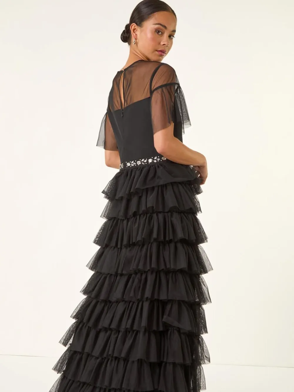 Get ready to sparkle and shine in this stunning mesh tiered dress. This dress features a classic round neckline, short sleeves with seam detail, and a flattering fit and flare silhouette. The mesh dress is adorned with intricate embellishments on the waist for added glamour. With a maxi length and zip fastening at the back, this dress is perfect for special occasions. Pair with strappy heels and a chic blazer for a sophisticated and elegant look that’s sure to turn heads. Regular side neck to hem 54.5″ / 138cm. Machine washable. 100% Polyester.