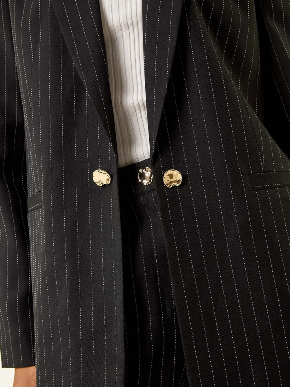 Be the first to review “Roman Black Pinstripe Revered Collar Blazer Online” Cancel reply