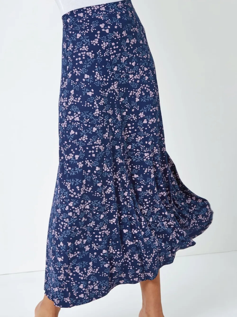 Update your everyday wardrobe with this jersey floral print midi skirt. Created with an elasticated waistband and vertical panels, this pull-on style makes for the ideal smart outfit. Pair this easy-to-wear skirt with a long-sleeve tee and a gilet for autumn walks in the countryside or transition into spring with a tucked-in t-shirt and pumps. Regular waistband to hem 33.5″ / 85cm. Machine washable. 96% Viscose, 4% Elastane.
