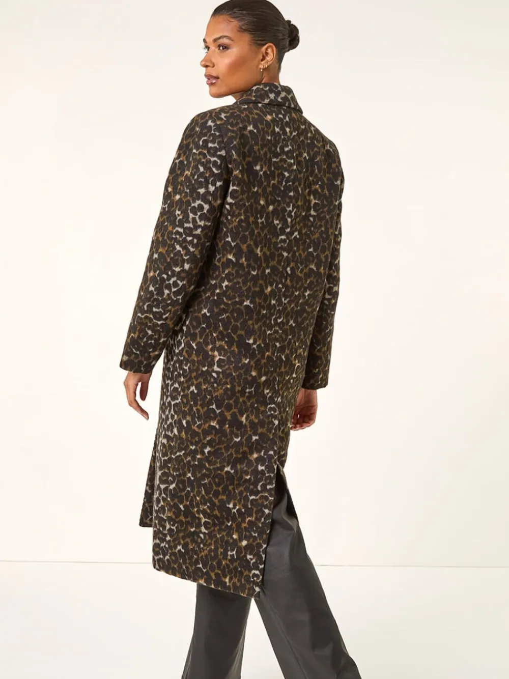 Put a fierce spin on your Autumn-Winter wardrobe with this stunning animal print formal coat. Crafted from a luxurious woven fabric, this long coat features an elegant edge opening and stylish angled side pockets for a modern touch. The stunning animal print adds a touch of attitude to your look, while the long sleeves keep you warm and on-trend. For a complete smart look, layer over a jumper and pair with ankle boots! Regular centre back neck to hem 46.5″ / 118cm. Dry clean only. 100% Polyester.