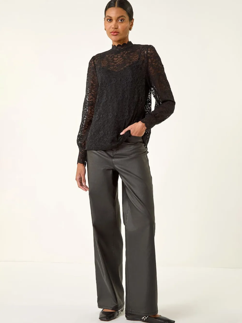 Roman Lace Frill High Neck Stretch Shirt Black Hot