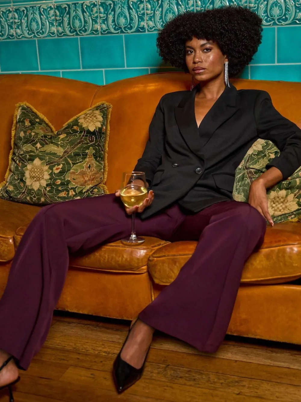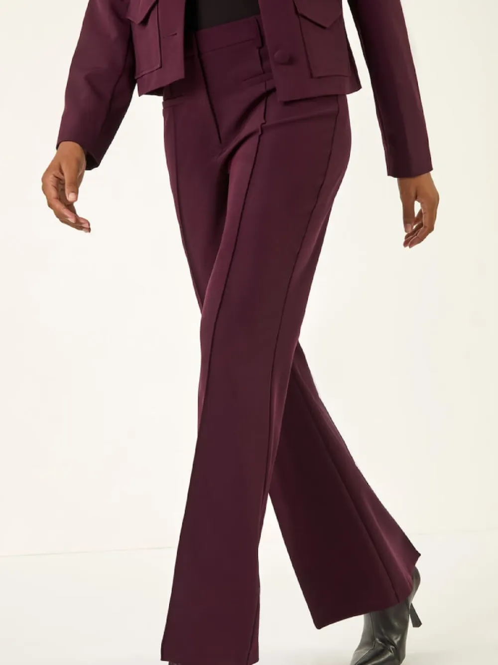 These chic bootleg trousers are a wardrobe staple this season. Featuring stylish front jet pocket details and a flattering bootleg cut, these trousers are perfect for both work and smart casual occasions. The pintuck centre front adds a touch of sophistication to the classic design. Pair with a crisp shirt and heels for a polished and professional look that will take you from day to night with ease! Regular inside leg length 30″ / 76cm. Machine washable. 90% Polyester, 10% Elastane.