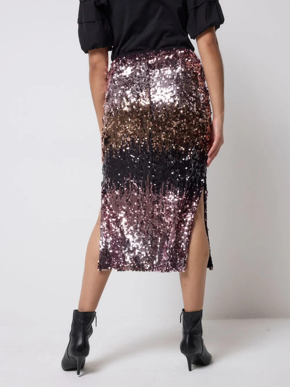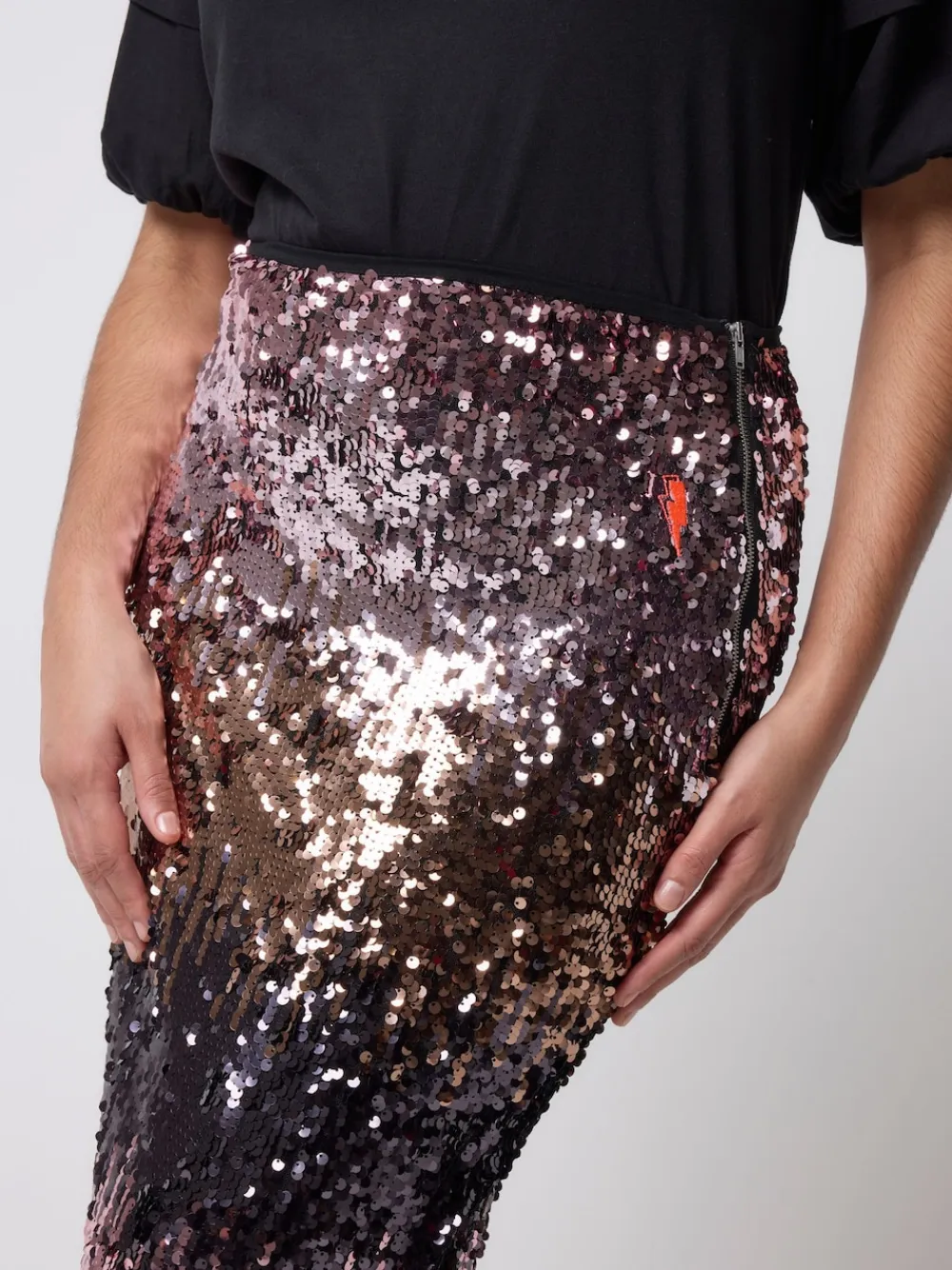Spruce up your skirts collection with this pink sequin side split skirt, it’s a statement making pick that has a beautiful ombre effect. It’s designed with sequins and lined with soft jersey fabric for comfort. Beautiful ombre effect sequins in pink to gold. Lined with super-soft jersey viscose. Feature zip fastening on the back. Side split at the hem. Signature neon pink embroidered lightning bolt on the hip. True to size. Machine washable. Outer 95% Polyester, 5% Elastane. Lining 94% Viscose, 6% Elastane.