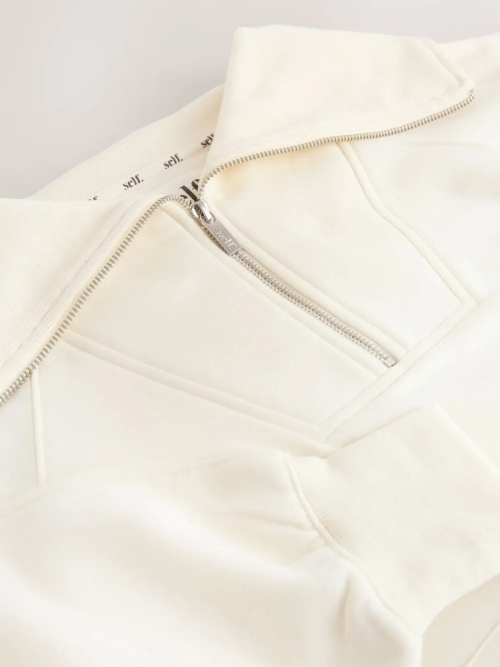 Stay effortlessly cosy with this super soft and comfy ecru half-zip sweatshirt. Designed for a relaxed fit, it features a striking large oversized collar that can be worn open or zipped up for extra warmth. This versatile piece is perfect for layering, with its clean ecru hue making it an easy addition to any casual ensemble. Super soft fabric Large oversized collar Half-zip fastening Kangaroo front pocket Ribbed cuffs and hem Subtle ‘self.’ branding detail on the front Machine washable. Main 55% Cotton, 45% Recycled polyester. Rib 58% Cotton, 39% Recycled polyester, 3% Elastane. Warning: Keep away from fire and flames.