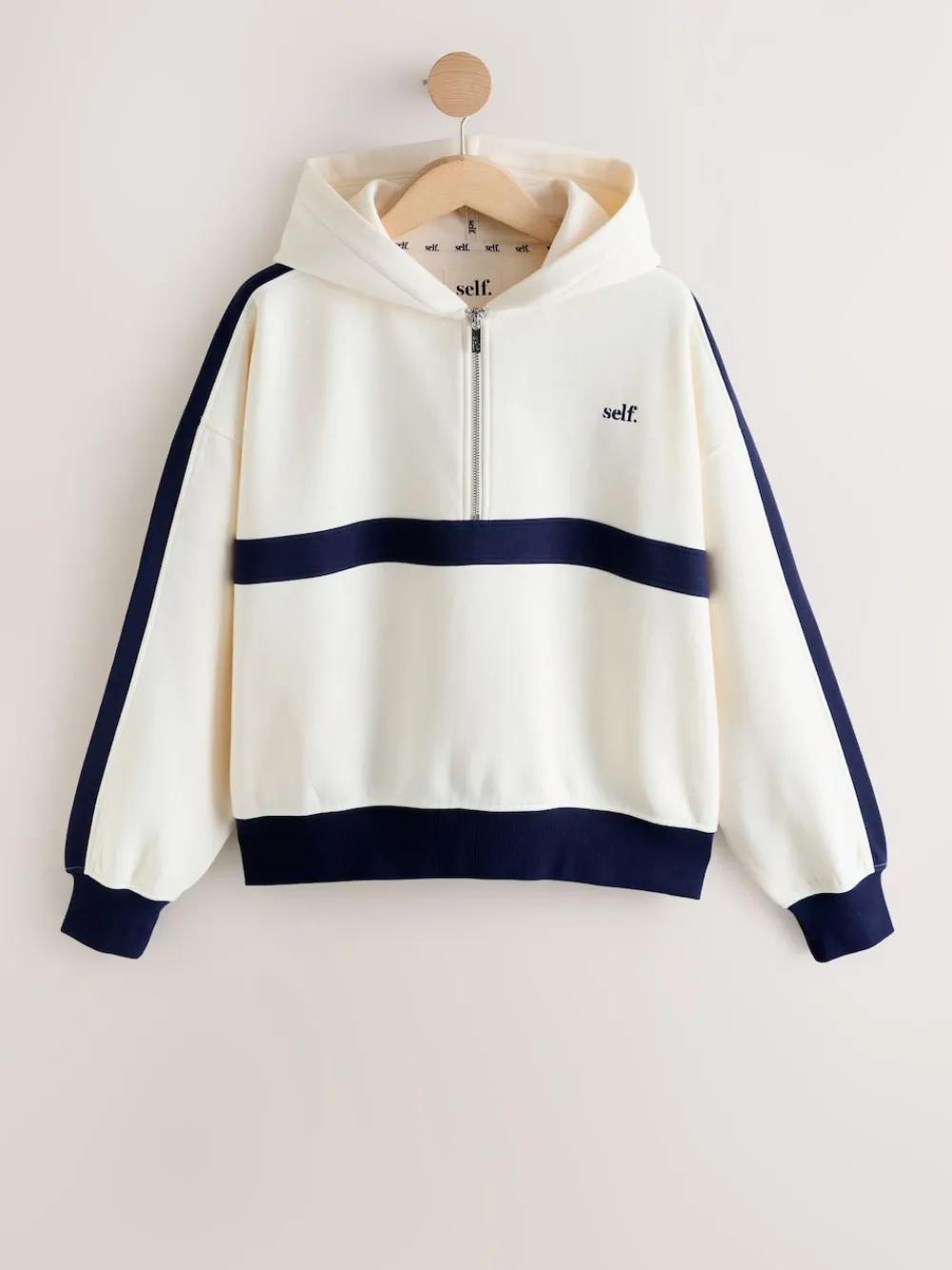 Layer up in style and comfort with this super soft fleece top. The classic ecru body is contrasted with bold navy stripes down the sleeves and across the chest for a sporty look. Featuring a cosy hood and a secure half zip fastening, this top is perfect for keeping warm during casual outdoor activities. Super soft fleece material Half zip fastening Hooded design Ribbed cuffs and hem Sporty stripe detail Machine washable. 57% Cotton, 43% Polyester. Warning: Keep away from fire and flames.