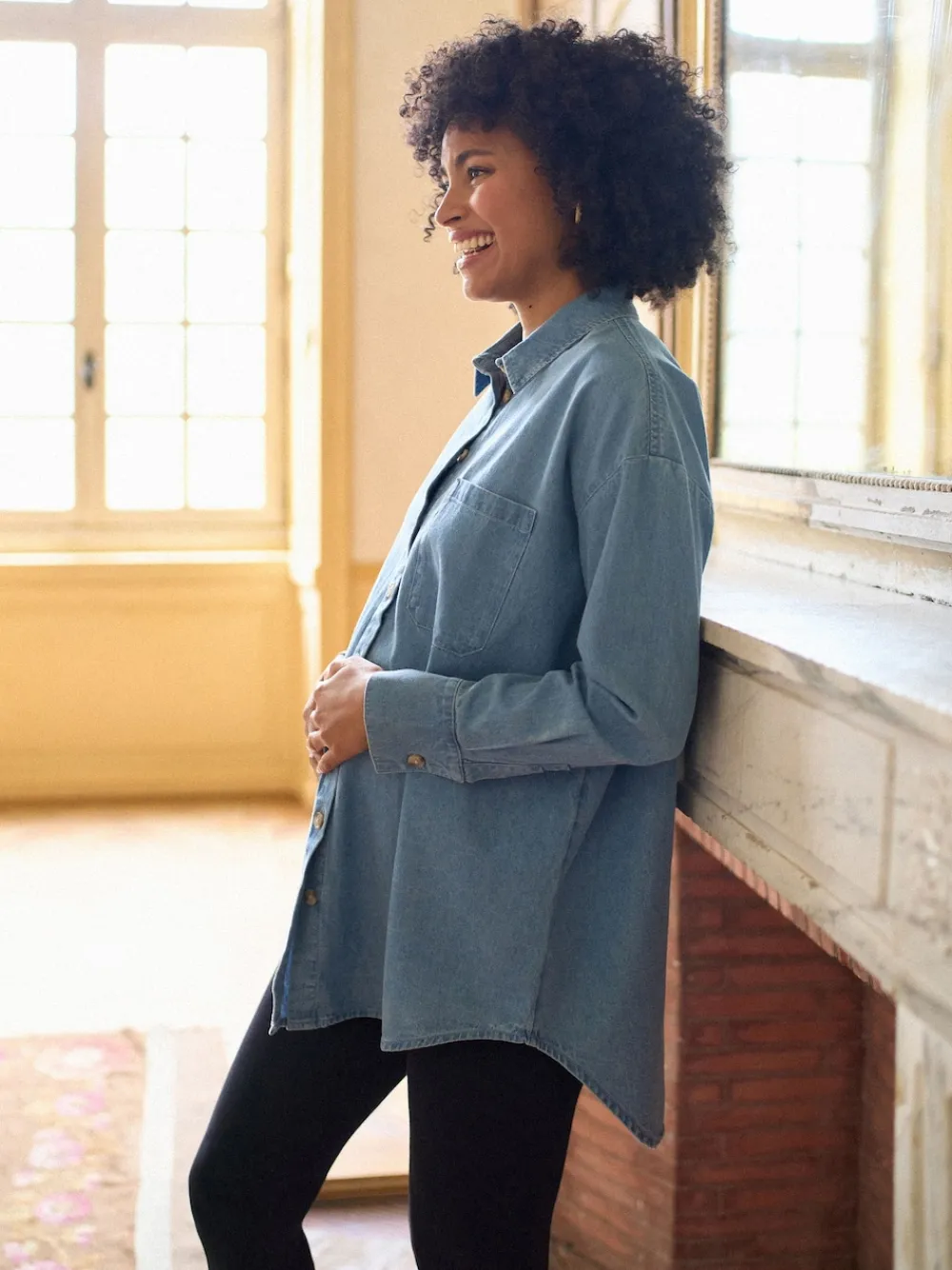 Relaxed super-soft denim shirt Classic collar Mock horn buttons Curved hem Patch pocket The staple denim shirt just got a serious style upgrade. A relaxed classic, this shirt will take you timelessly through your pregnancy and beyond. The curved hem flatters your changing body, while the looser fit allows for plenty of comfort (and room) as your baby bump grows. Wear it done up with your favourite trousers, layer over leggings and a simple tee for everyday comfort or pair with jeans for a contemporary take on double denim.Buy your pre-pregnancy size. With over 20 years of maternity expertise, Seraphine styles are designed to grow with you, adapting with you through pregnancy and motherhood. Machine washable. 100% Cotton.