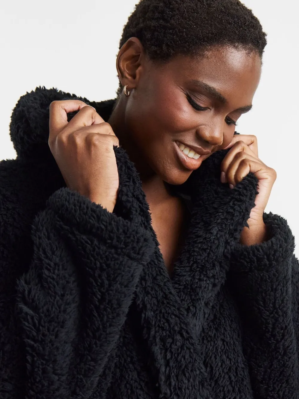 Take some rest & recuperation time for you in our fluffy teddy fleece dressing gown. Regular relaxed fit. Tie Detail. Mdi Length. Neutral beige colour. Hood Detail. Soft, fluffy teddy fabric. Two front patch pockets. Designed to keep you warm and cosy throughout the seasons. Machine washable. 100% Polyester.