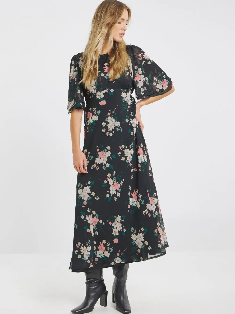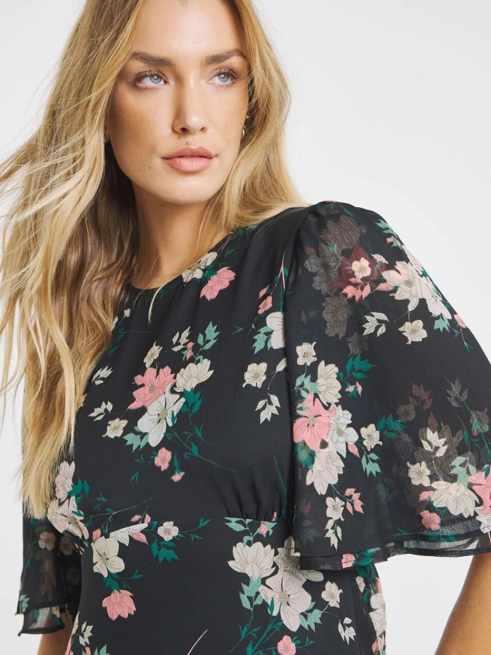Perfect for a day-to-night look, shop our Georgette Maxi Dress. Maxi length. Angel Sleeve. Round Neck. In a lovey, floral print. Style with sandals to complete the look! Regular side neck to hem 52″ / 132cm. Machine washable. 100% Polyester.
