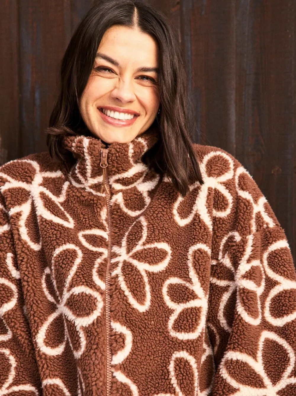 Stay warm and whimsical in the Skinnydip Doodle Flower Borg Jacket in Brown—your new go-to for cozy vibes and feel-good style. Machine washable. 100% Polyester.