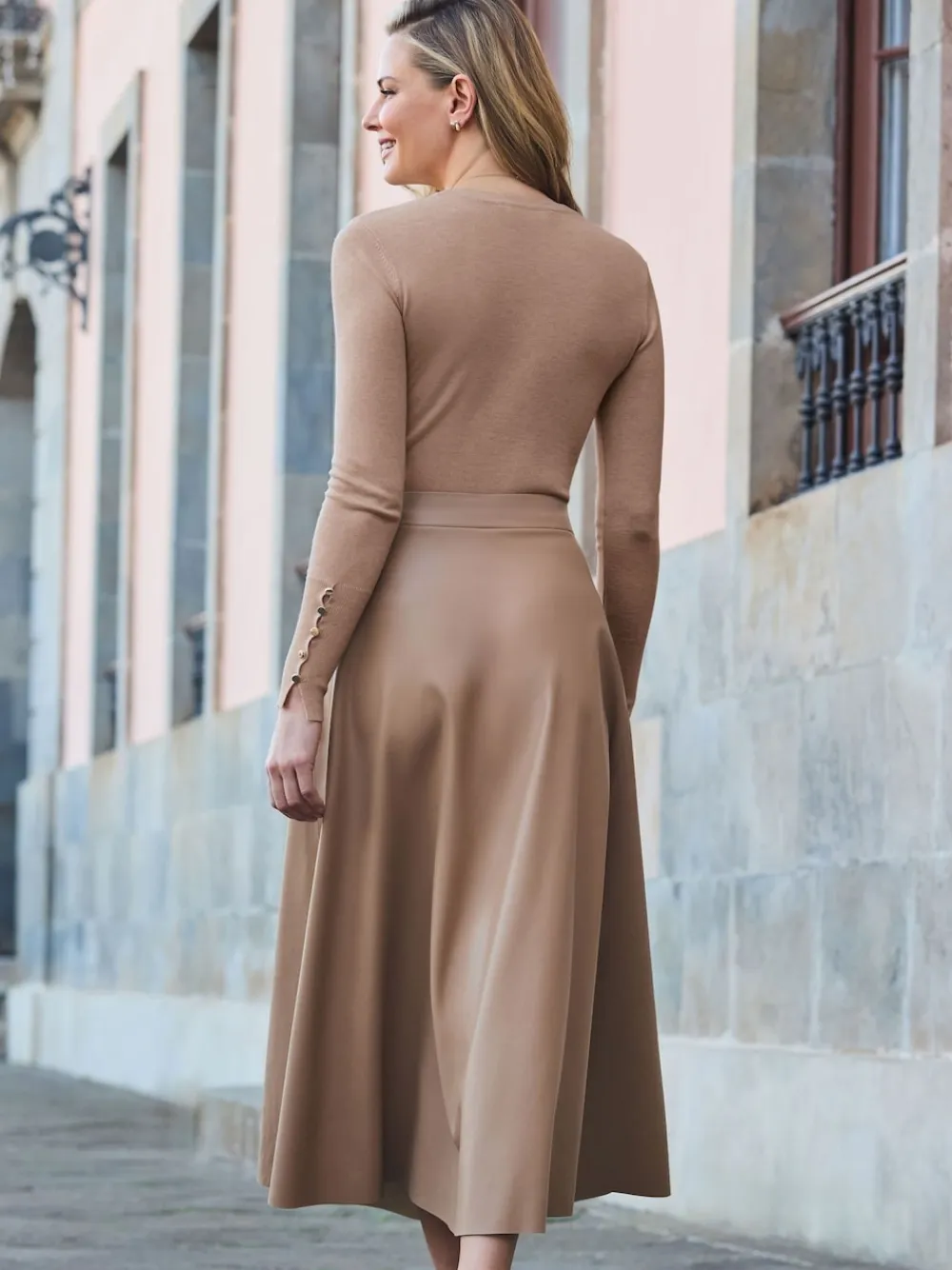 The one that’ll have everyone asking ‘where did you get that?’, our faux leather looks so luxe, sits high on the waist for an ultra-flattering fit, full midi style creates a gorgeous silhouette, pair with a polo neck and ankle boots for the office, add a nice top and heels for drinks and dinner. Machine washable. 100% Polyurethane.