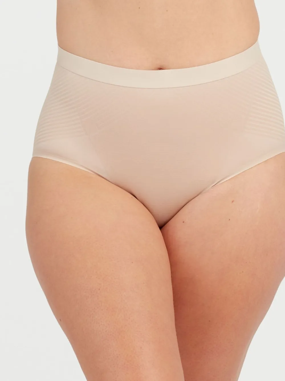 Experience lightweight and powerful compression with our SPANXshape™ Invisible Brief. Featuring advanced single-layer Printed Power® shaping technology made with LYCRA® FitSense™ Print Technology it includes targeted tummy control panels that wrap around for 360-degree shaping. Designed with ultra-thin, breathable fabric that is moisture-wicking and quick-drying, a cotton gusset for comfort, a no-slip silicone waistband that prevents rolling, and no-dig flexible leg openings, this sleek shapewear design goes undetected under any outfit. Main 55% Nylon, 45% Lycra® Elastane. Gusset 100% Cotton.