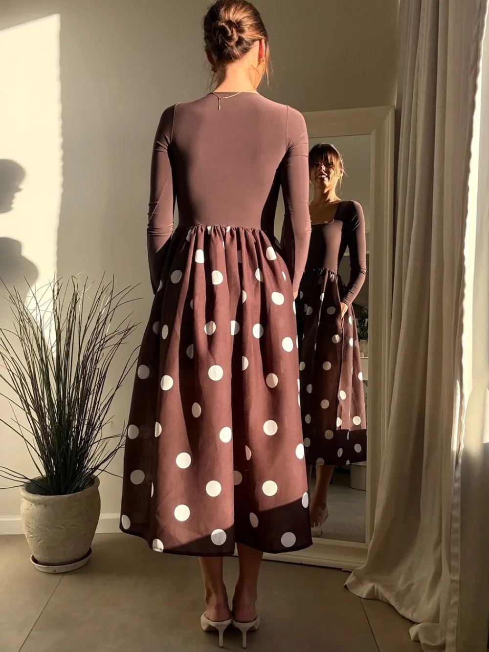 This dress features a refined jersey long sleeve scoop top elegantly paired with a woven polkadot skirt in a rich chocolate brown hue. The cream spots add a subtle contrast, creating a timeless look that balances comfort with sophistication. Perfect for occasions that demand understated elegance with a modern touch. Machine washable. Main 95% Polyester, 5% Elastane. Lining 100% Polyester.