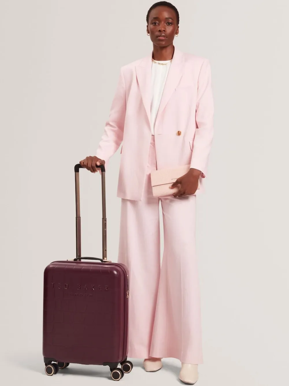 Inspired by Ted Baker’s Icon Bag, Icon Case brings statement design to every journey. With a croc embossed finish, bold branding, and a refined silhouette, Icon Case is designed for the traveller looking to stand out. This beautifully coordinated 4-piece collection includes a Vanity Case, Cabin, Medium, and Large suitcase. Details include a signature print lining with an organised interior to make packing easy, an embedded TSA lock, and double wheels with branded wheel caps. Height 55cm Width 40cm Depth 20cm 100% ABS (Acrylonitrile Butadiene Styrene).