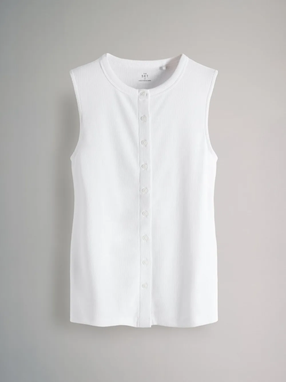 Elevate your essential layering pieces with THE SET 3 Pack of Button Through Ribbed Vests. This versatile multipack includes three vests in essential core colours: crisp white, classic black and rich chocolate brown. Each vest is crafted from comfortable ribbed fabric and features a flattering sleeveless design with a neat button-through front. These vests are perfect for layering under shirts or wearing on their own in warmer weather. 3 pack Ribbed fabric Button through Core colours 3 x Vest 95% Cotton, 5% Elastane.