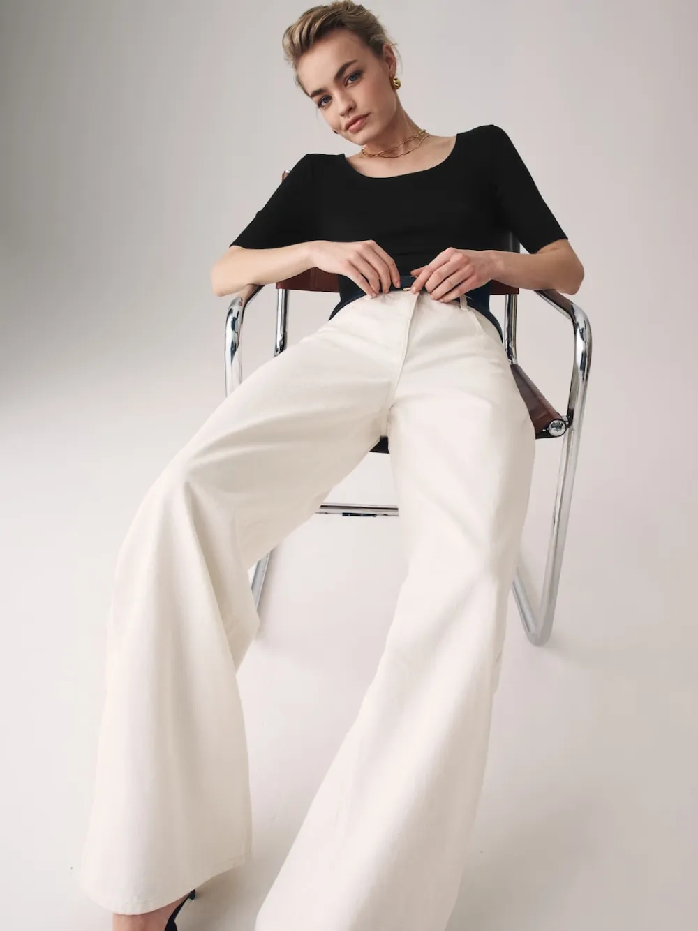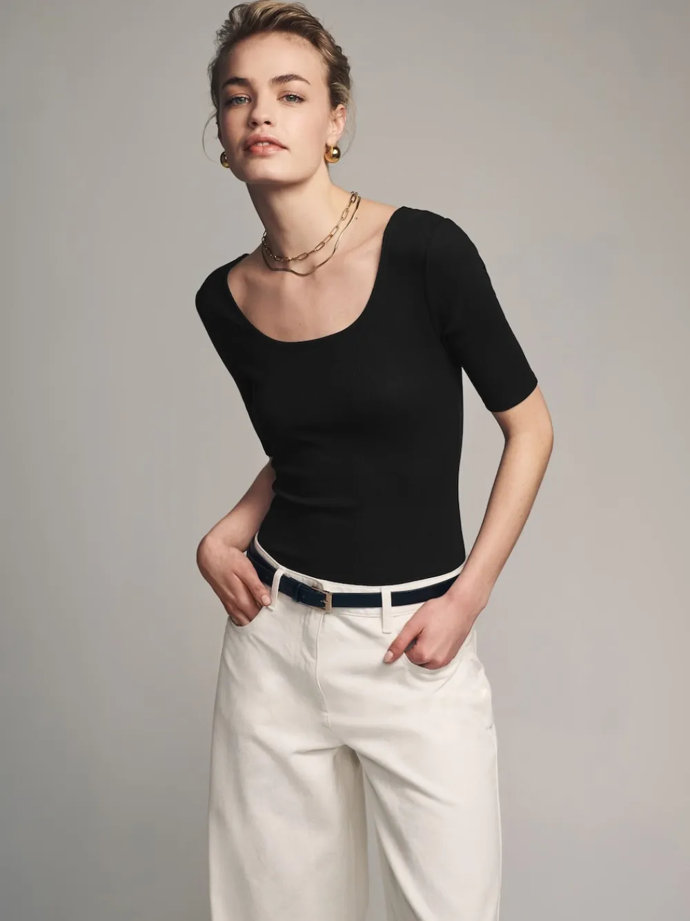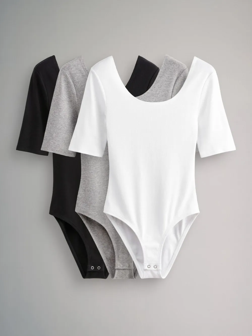 Introducing the Twenty Days Edit, part of Black/Grey/White THE SET – our carefully considered daily essentials for building the perfect capsule wardrobe. Our scoop neck bodysuits have been designed to offer a smooth finish. Made from a soft fabric with a ribbed finish, the short sleeve tops have a stylish scooped neckline and come in three colourways. Pair them with a blazer and wide leg jeans for a sleek outfit. 3 pack Scoop neck Ribbed Machine washable. Bodysuit Black and Bodysuit White 95% Cotton, 5% Elastane. Bodysuit Grey 86% Cotton, 10% Viscose, 4% Elastane.