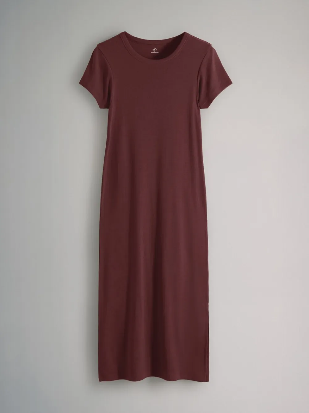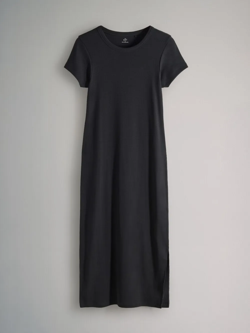 Refresh your casual dress collection with THE SET 3 Pack Short Sleeve Ribbed Midi Dresses. Including three core neutral colours: classic black, rich chocolate and deep charcoal. Each dress is crafted from comfortable ribbed fabric, offering a flattering, close fit. They feature a simple crew neck and short sleeves, making them perfect for warmer weather or layering. The midi length is finished with a neat split hem, adding movement and contemporary detail. 3 pack Midi length Rib fabric 3 x Dress 95% Cotton, 5% Elastane.