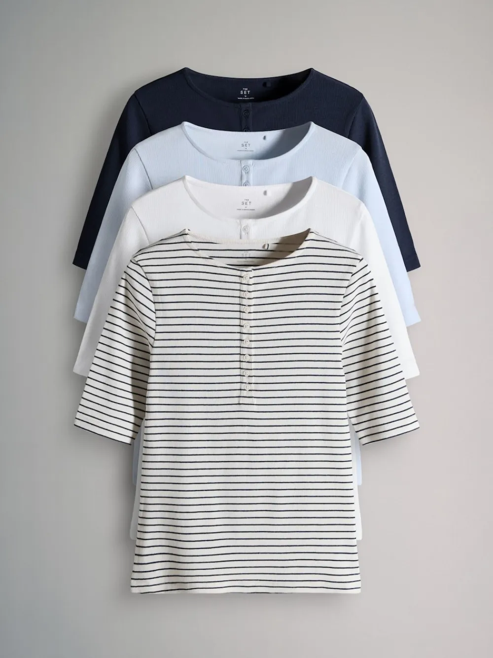 Be the first to review “The Set 4 Pack Ribbed Half Sleeve Henley T Shirt Navy/Light Blue/White/Stripe Outlet” Cancel reply