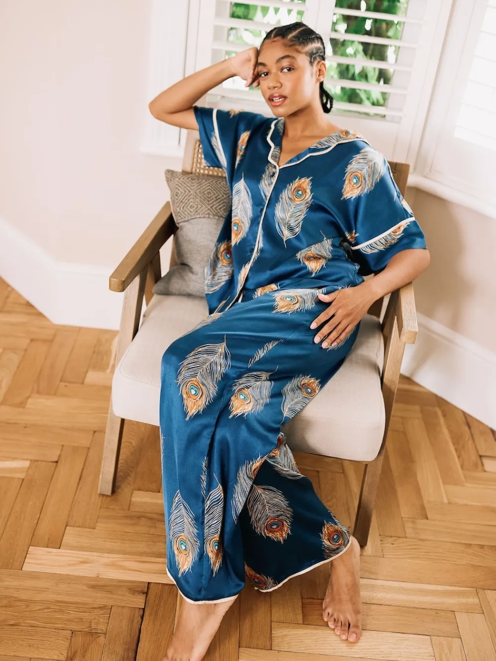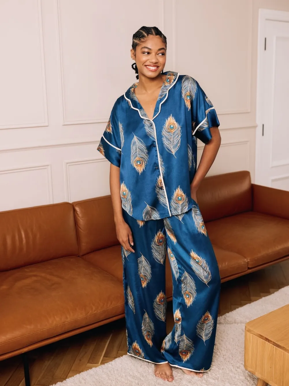Featuring Their NIbs iconic peacock feather print with a twist on fluid satin, the oversized silhouette is relaxed yet refined — perfect for slow mornings, movie nights, or whenever you want to lounge in style. The shirt’s softly draped shape pairs perfectly with the wide-leg, drawstring trousers for that floaty, feel-good fit. Machine washable. 100% Polyester. Warning: Keep away from fire and flames.