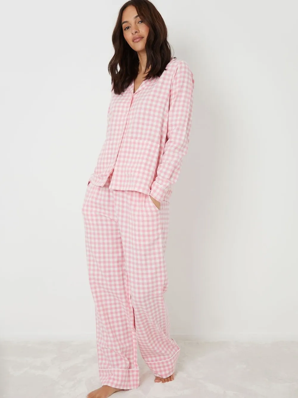 Be empowered and cosy in our Threadbare check pyjama set. All over check print. Long sleeves. Revere button up shirt with piped collar. Patch pockets. Matching wide leg bottoms. Elasticated waistband with drawcords. Two side pockets. Model wears UK size 8. Machine washable. 100% Cotton.
