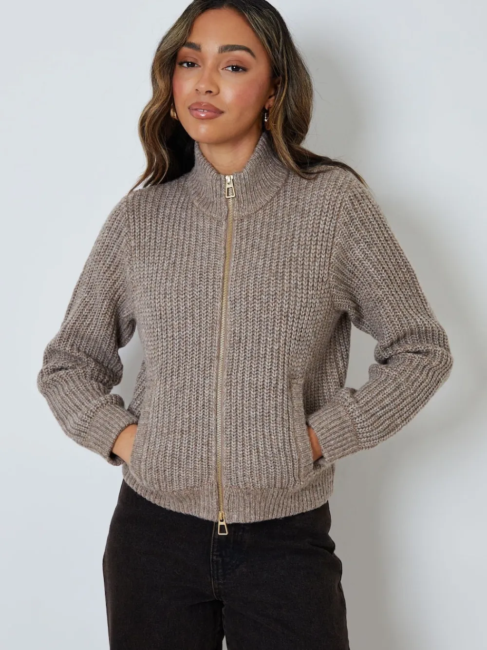 Threadbare Zip Through Knitted Bomber Jacket Brown New