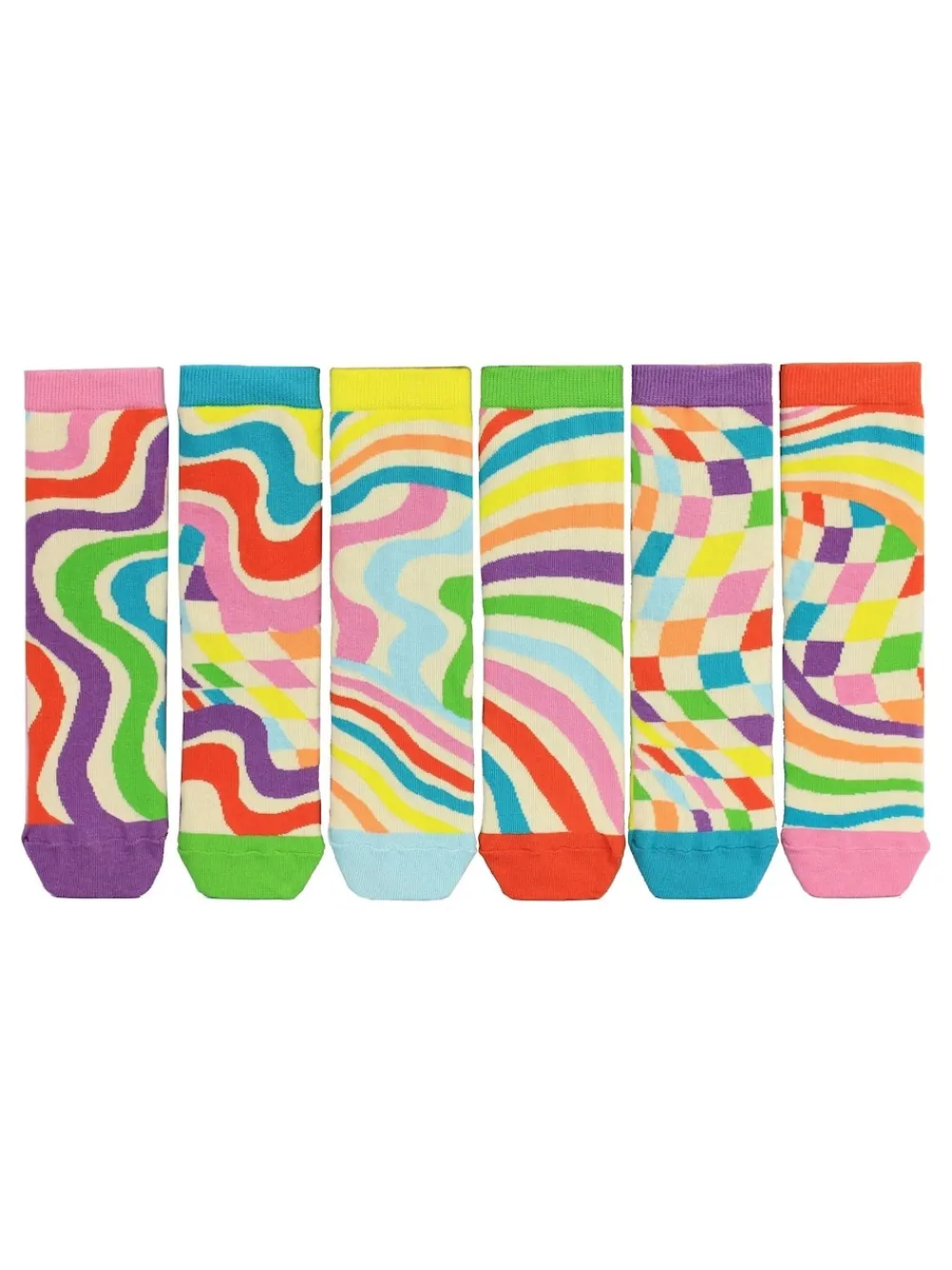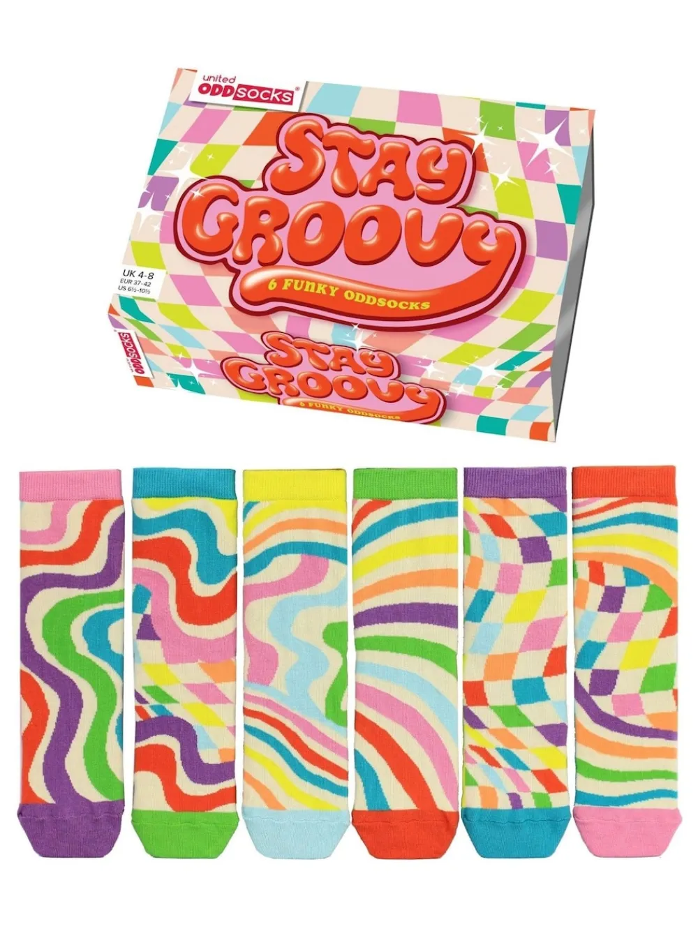 Get your groove on with Stay Groovy socks! Featuring funky, disco-inspired patterns straight from the 70’s, these bold designs will have your feet dancing all day. Perfect for those who love retro vibes. Step out in style, channel your inner disco fever, and let your feet shine on the dance floor or wherever life takes you. Stay Groovy—because every day deserves a little boogie! 6 Individual socks to mix and mismatch in UK sizes 4-8. Machine washable. 73% Cotton, 18% Nylon, 8% Polyester, 1% Elastane.