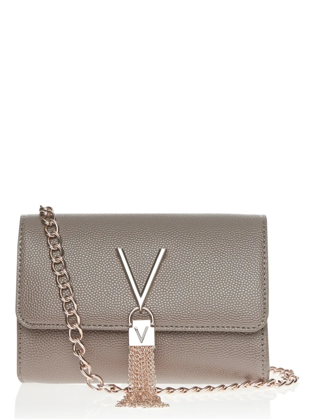Slick and sophisticated, a fold-over bag from Valentino Bags featuring a chain shoulder strap, a tassel detail and a zip compartment. Bag Dimensions: 17cm x 11.5cm x 4cm. Height 17cm Width 11.5cm Depth 4cm 100% PU.