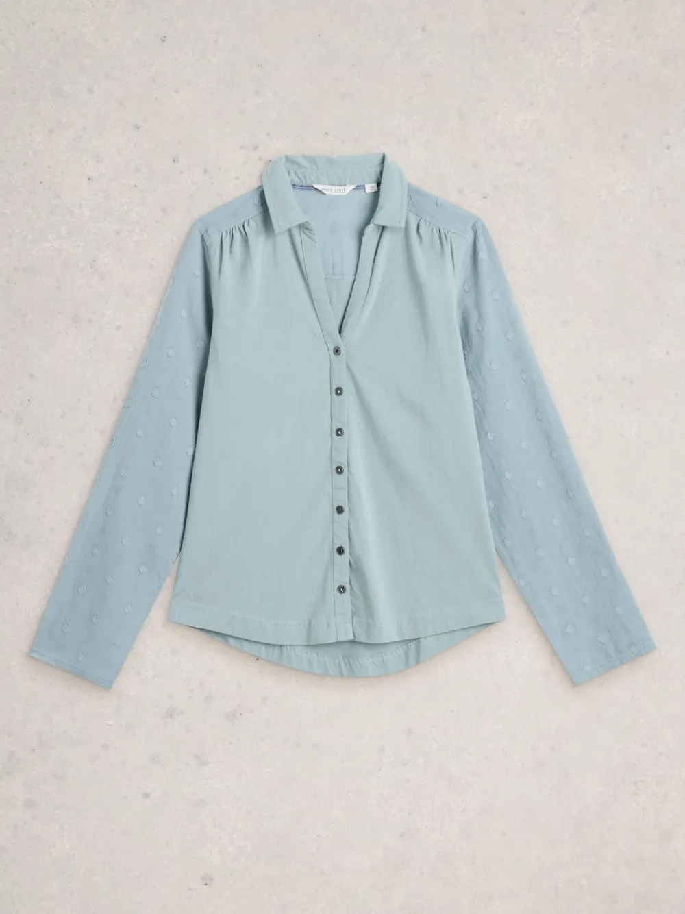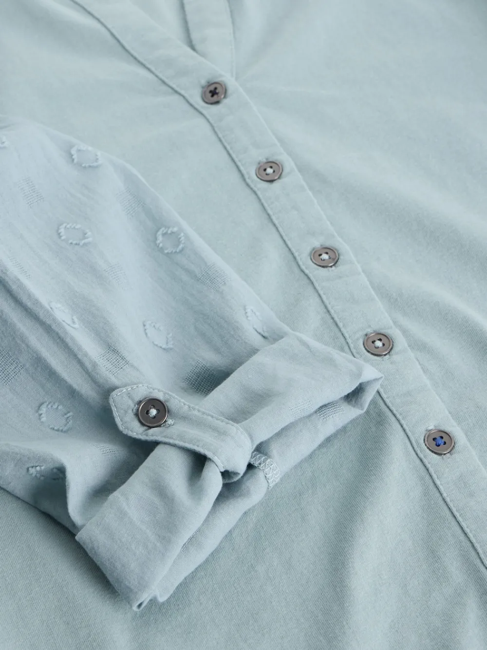 A classic button through long sleeve shirt with woven sleeves and a woven shoulder panel. Machine washable. 100% Organic cotton.