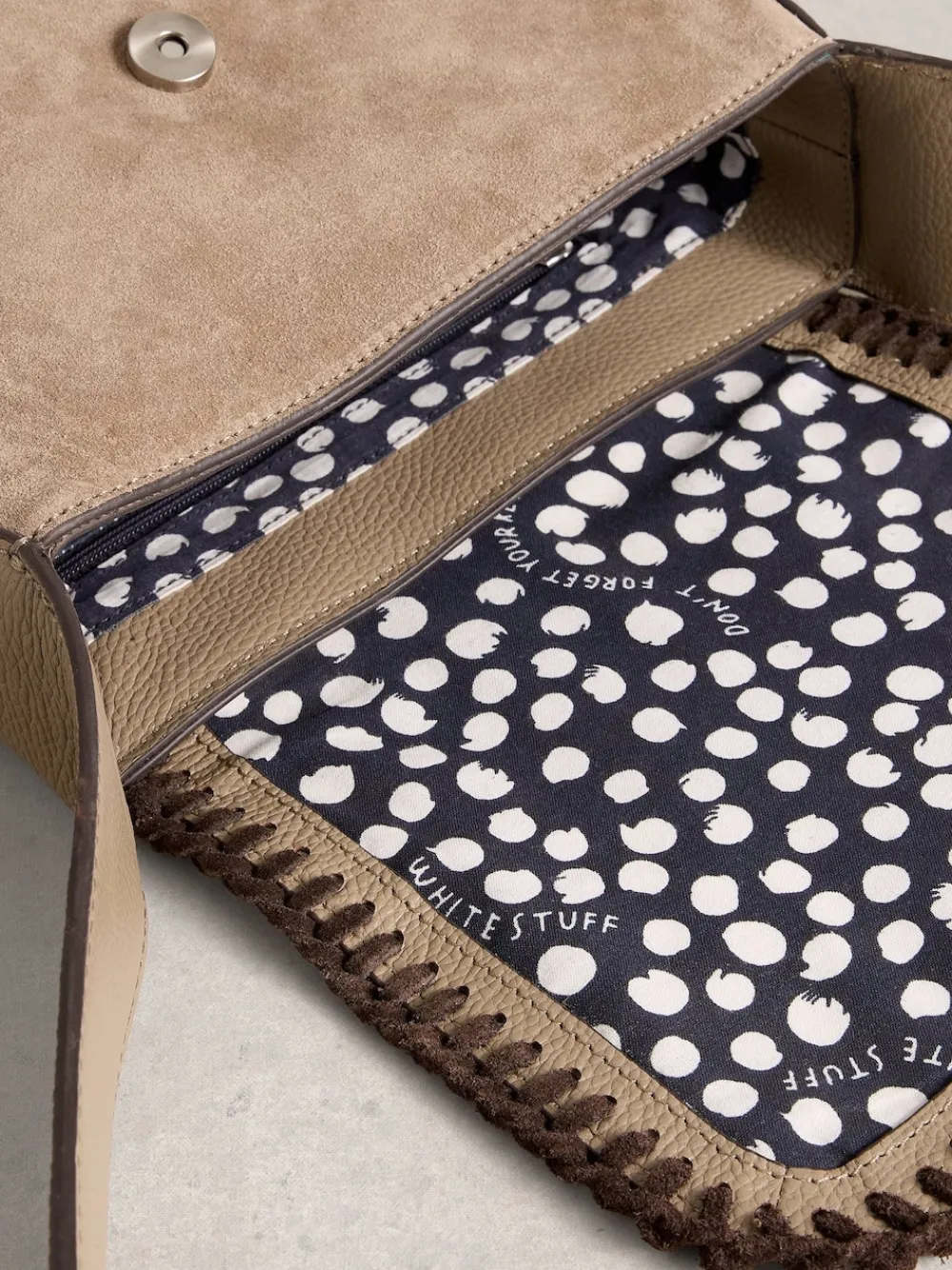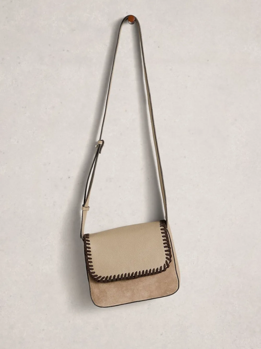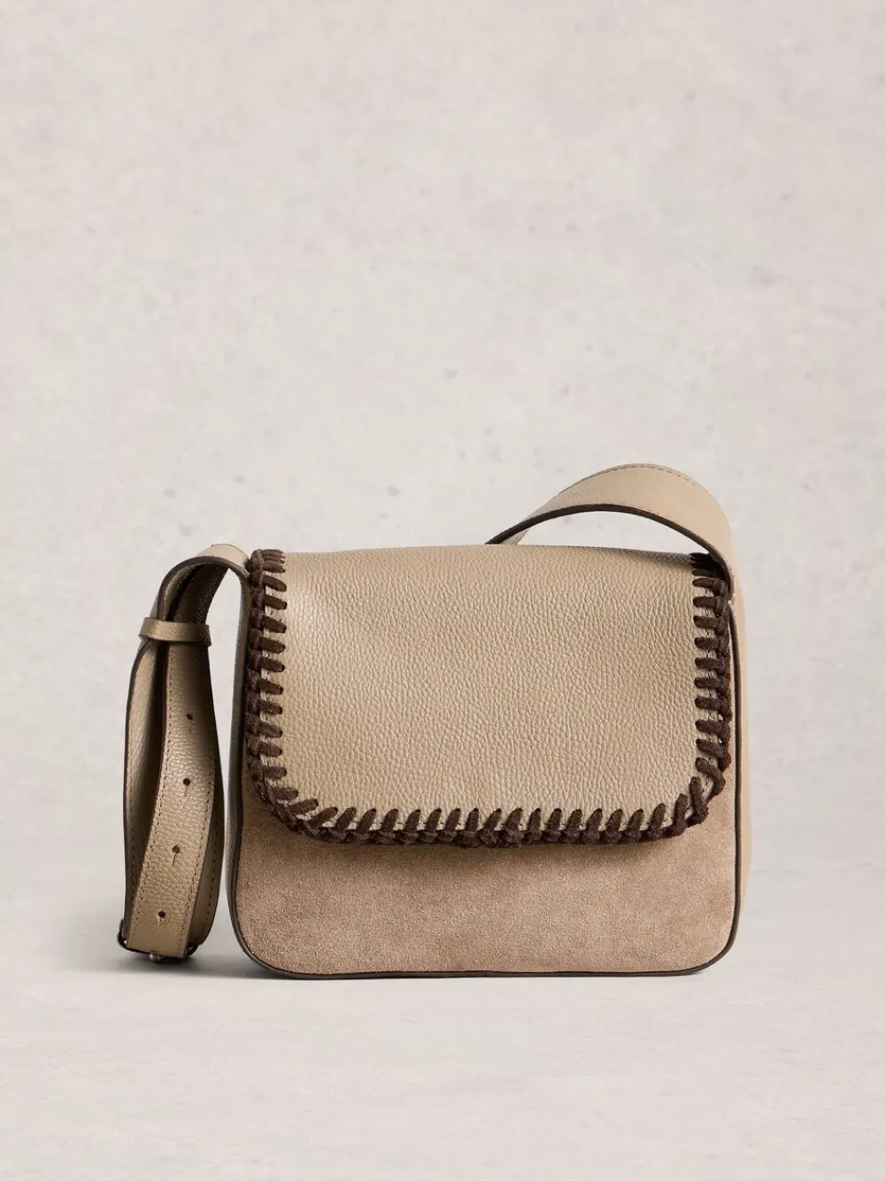 Simple Flapover Cross-body Bag With Whipstitch Suede Detailing. Thick Crossbody Strap With Pip Stud Adjusters. One Inside Slip Pocket, One Zipped Pocket. One Slip Pocket At The Back. Maglock Closure. Height 18cm Width 22.5cm Depth 7.5cm Outer 100% Leather. Lining 100% Cotton.
