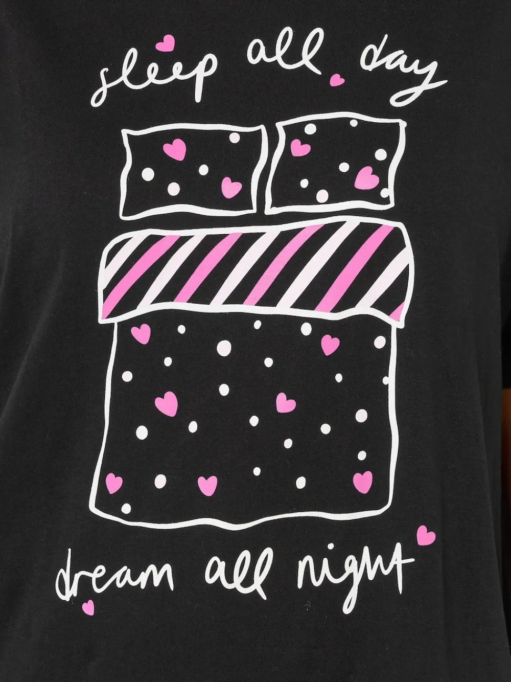 Fit & Fashion Notes: This maxi nightdress is the perfect option for cosy mornings at home. Made from a comfortable jersey fabric, it features a ‘sleep all day dream all night’ slogan with a bed graphic and short sleeves. Team with a pair of slippers for a look that is perfect for your next night in. Why We Love It: A must-have print to add to your collection. Features: Sleep all day dream all night slogan Bed graphic Mini length Short sleeves Crew neckline Made from a comfortable jersey fabric 100% cotton Machine washable Model is 5ft 10.5”/178cm and size UK 16/EU 44. Machine washable. 100% Cotton.