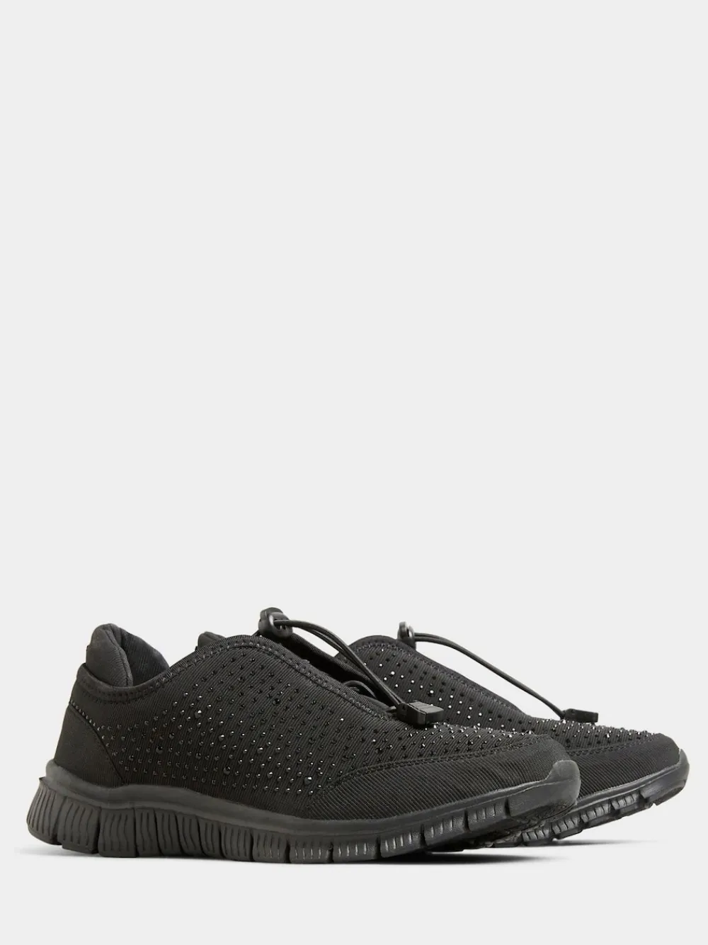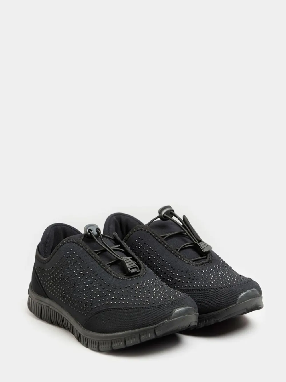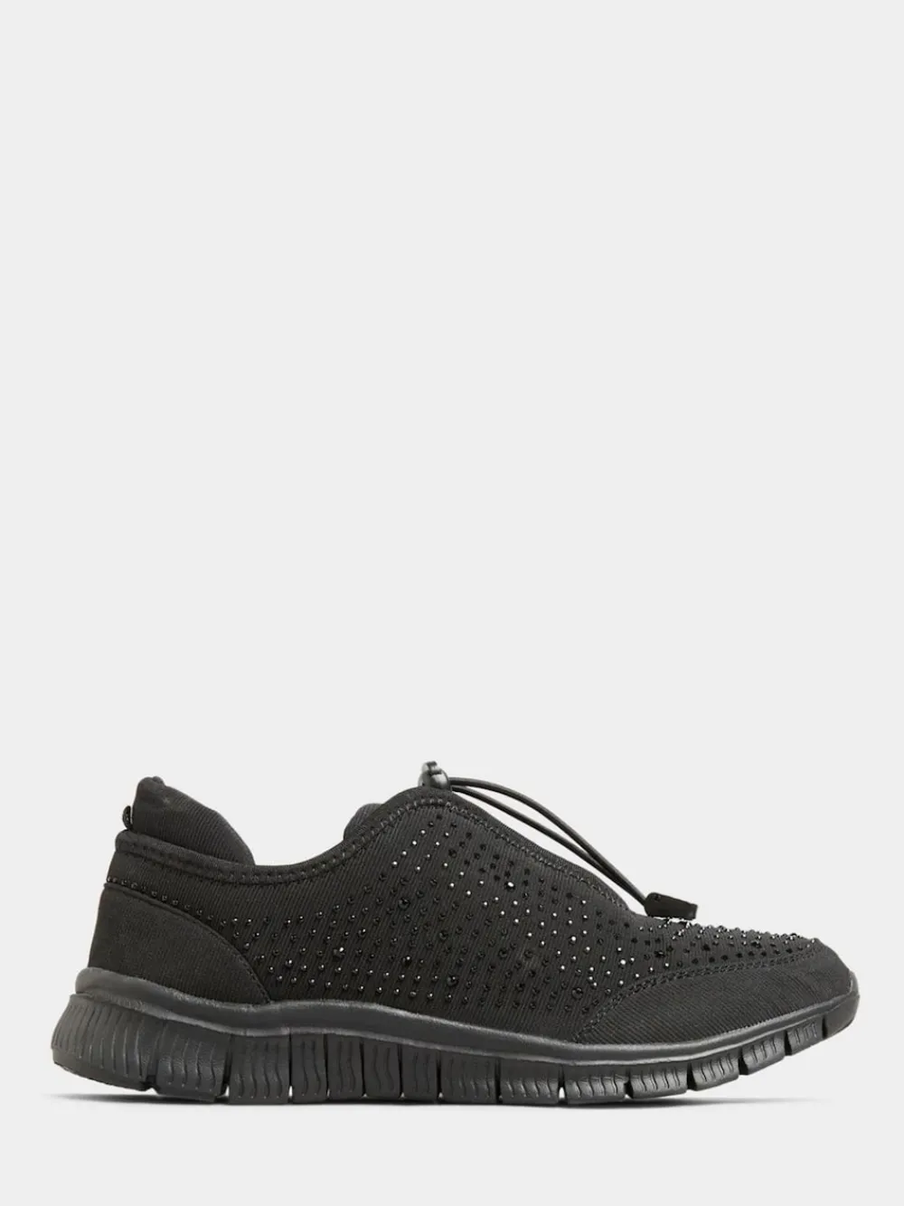 Add a touch of glam to every step with these stylish and comfortable wide fit black trainers. Offering lightweight and flexible memory foam cushioning for all-day comfort, they feature all-over diamante embellishment and finish with an elasticated drawcord fastening for the perfect fit. Upper – 100% Other fibres, Lining. and Sock – 100% Other fibres. Sole – 100% Rubber.