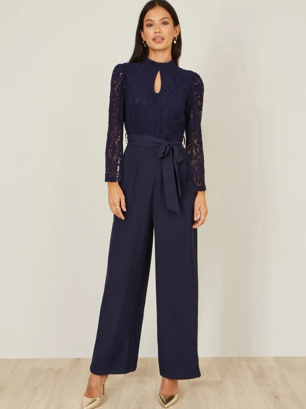Ultra pretty details for party season in this jumpsuit from Yumi. In a flattering shape, with sheer long sleeves, split in the back that we love for any invite, Perfect for winter weddings, with all over Lace applique detail, and pockets! The tie at the waist and wide legs ensure you will look a million dollars. Regular inside leg length 58.5″ / 148.5cm. Machine washable. Shell 100% Polyester. Lining 100% Polyester.