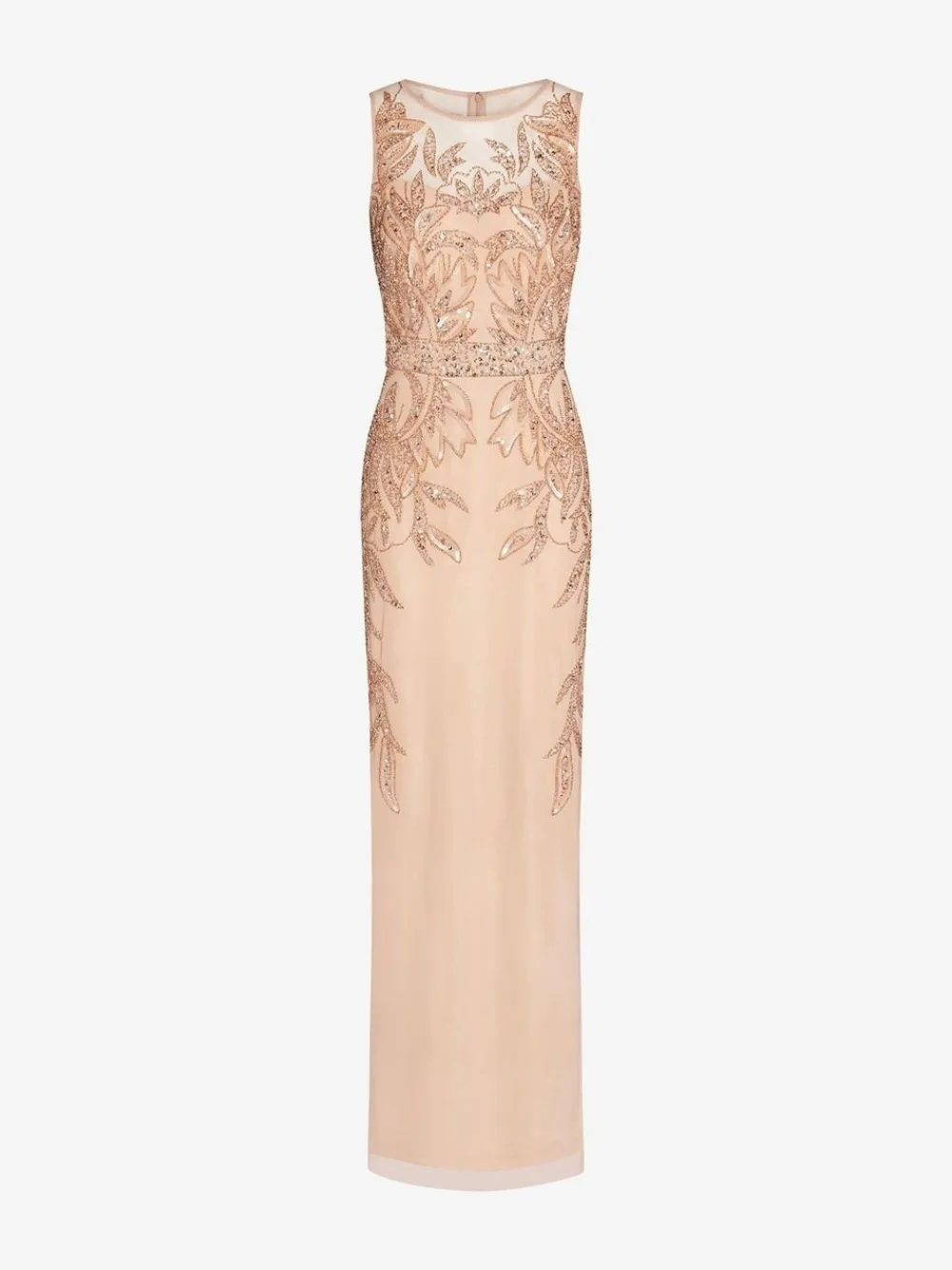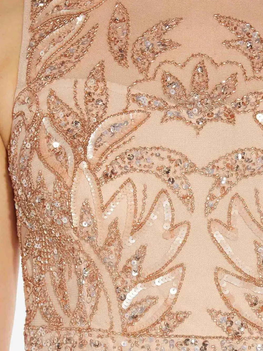 Our own hand-beaded gown, designed in a slim, streamlined fit with a flattering high neckline and light-as-air flowy skirt. The glittering pattern work adds a touch of elegance and sparkle. Sponge clean only. 100% Polyester.