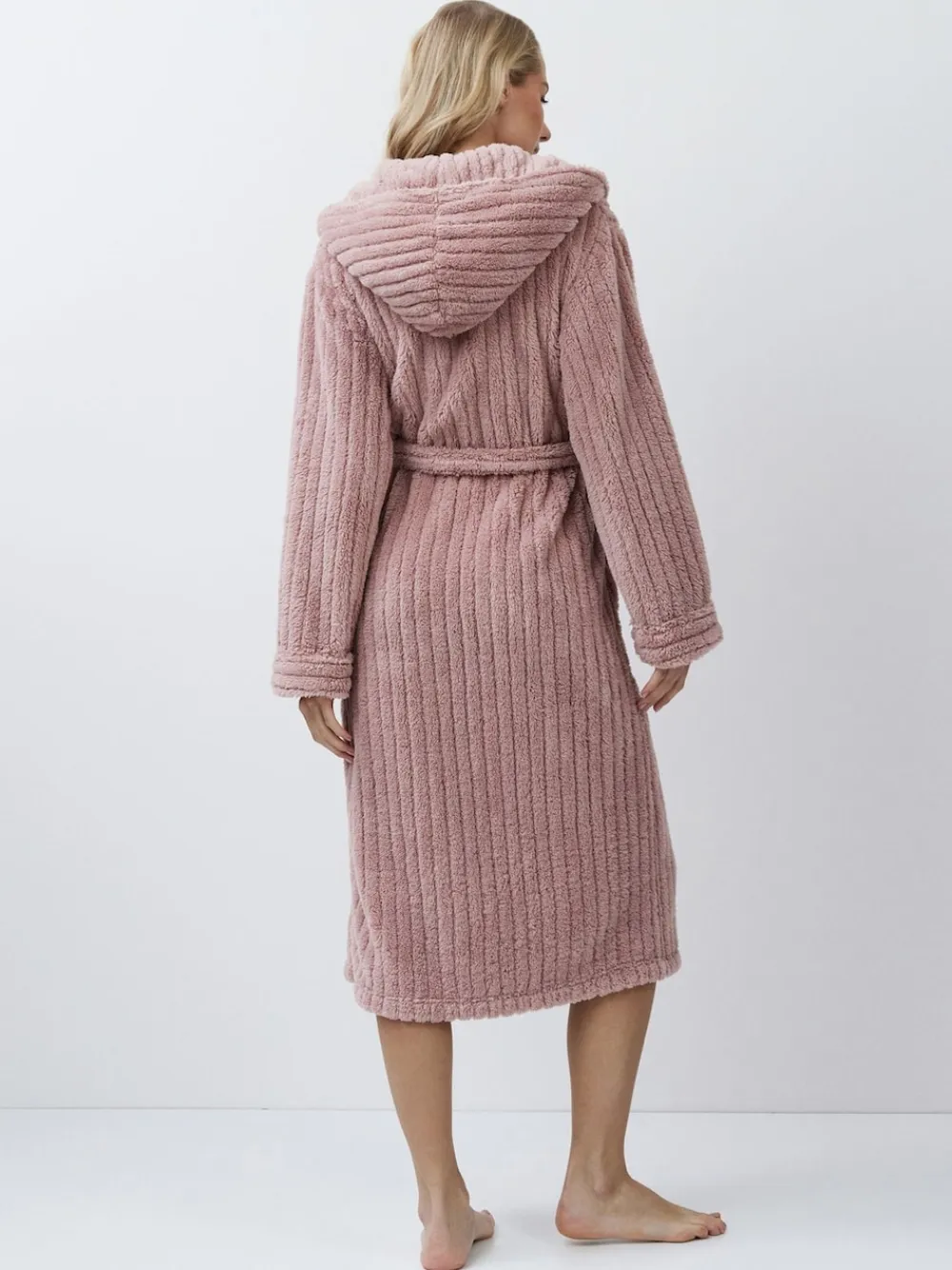 Cosy and stylish hooded bathrobe, colour in muted rosewood, with a soft textured ribbed design. Made of plush polyester fabric with a ribbed texture for extra warmth. Features a relaxed fit with a shawl collar and a comfortable hood. Square-shaped pockets for a structured look and practicality. Self-fabric belt for an adjustable fit. Designed to fall below the knee. Washable. 100% Polyester.
